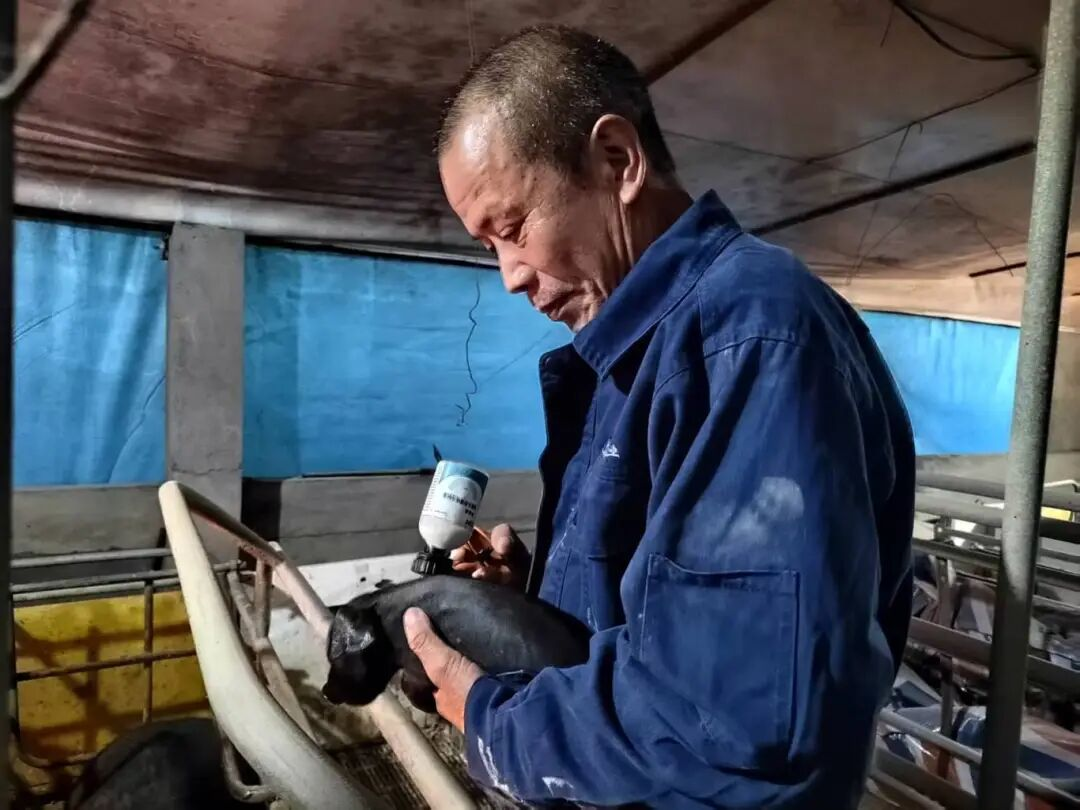 养殖技工张怀财在产房为仔猪护理治疗(刘紫阳 摄)