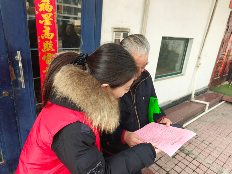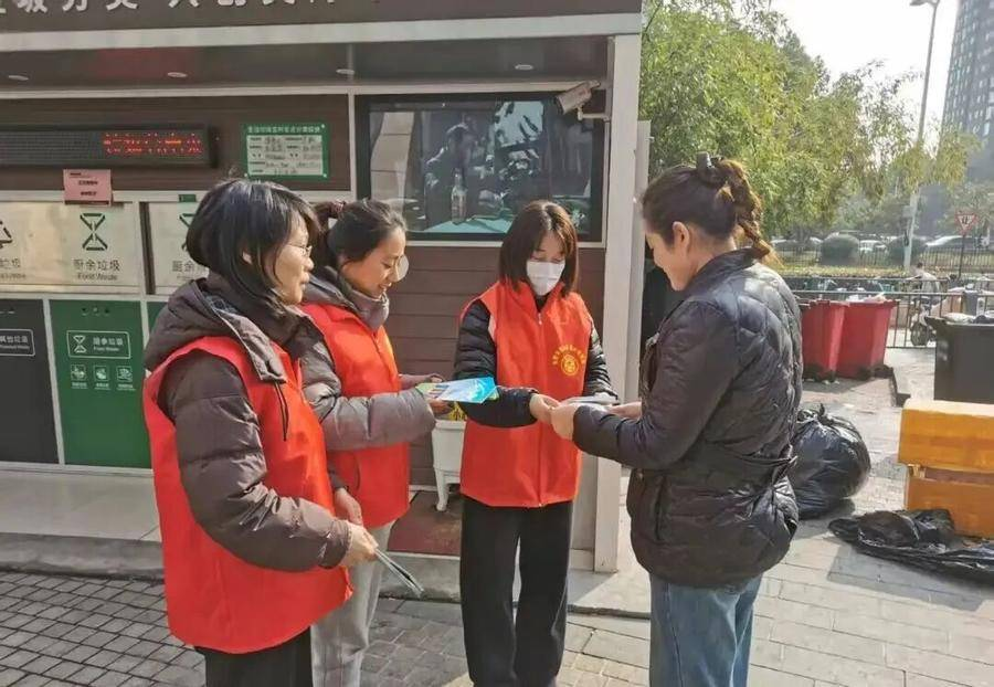 琥珀街道志愿者深入小区,向居民宣传垃圾分类。(许丽丽 摄)