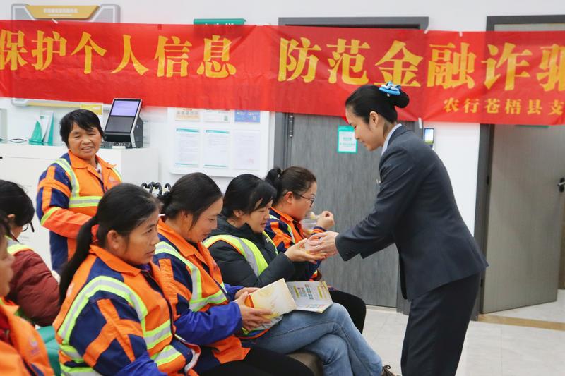 近日,农行苍梧县支行组建“巾帼力量”志愿服务队,开展“致敬城市玫瑰金融守护芬芳”主题公益活动。通过方言讲解、案例分析等形式,为女性环卫工人开展反诈知识普及,重点讲解账户安全、识别电信诈骗等实用内容。