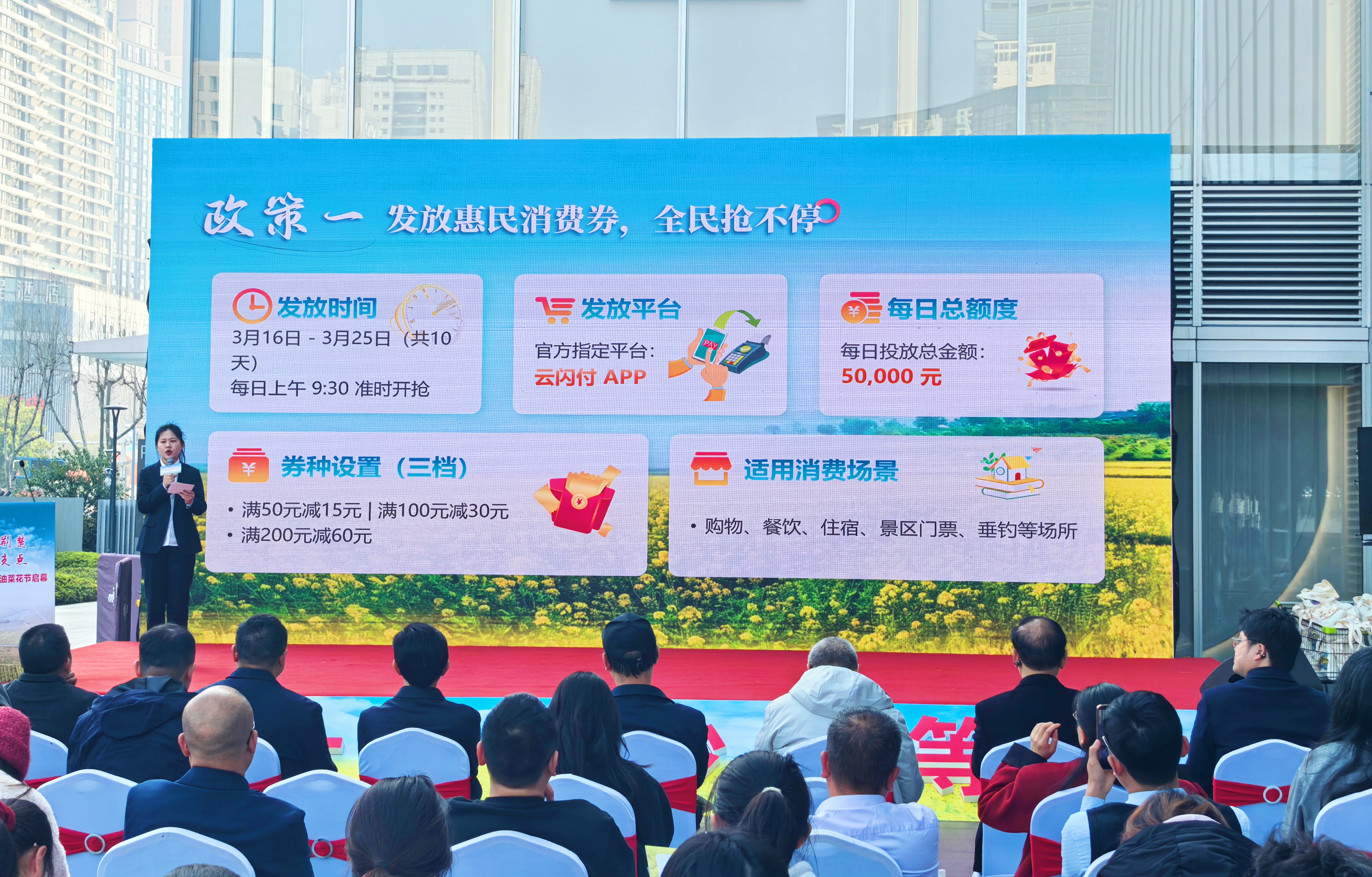现场介绍油菜花节促消费“大礼包”(余惠玲 摄)
