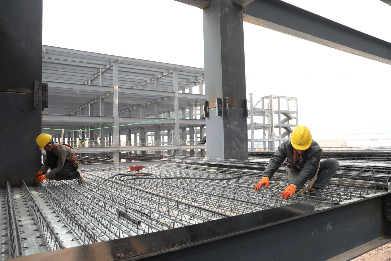 “目前项目所有钢结构厂房主体已全部吊装完毕,现阶段正同步推进钢筋桁架楼承板铺设与外墙砌筑工作,我们采用‘铺一层楼板、砌一层墙’的流水作业模式,最大限度提高施工效率。”疏附县仓储物流中转集散中心建设项目执行经理刘向东介绍,项目计划于4月中旬完成主体施工,随即进入装饰装修阶段,力争6月份全面完工并交付使用,确保项目早日发挥效益。