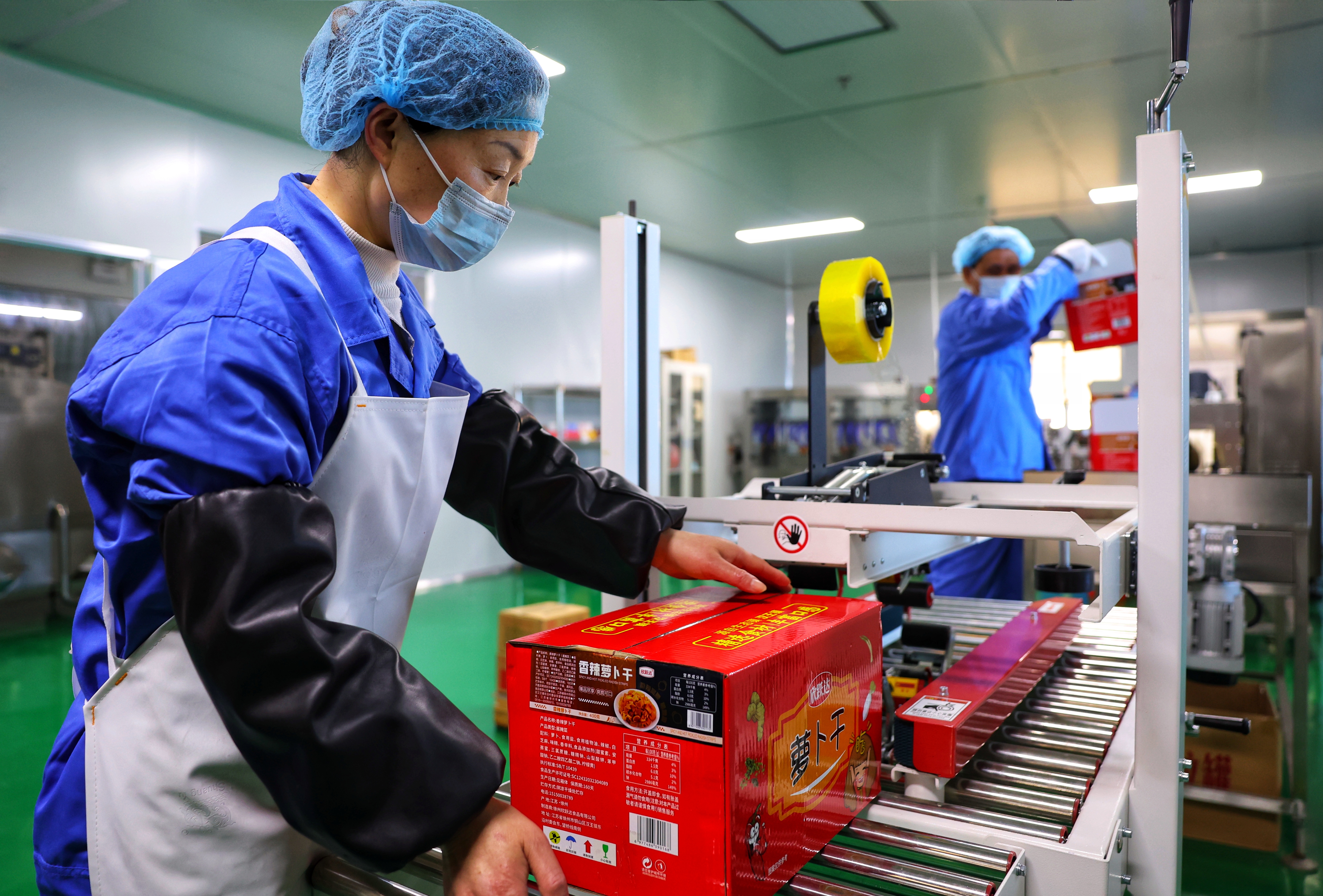 徐州欣跃达食品有限公司工人正在检查生产产品(高刚 摄)