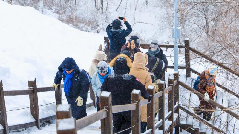 游客们身着厚装,沿木栈道拾级而上,在皑皑白雪中沉浸式感受北国冰雪的纯净与壮美。(曹秀峰 摄)