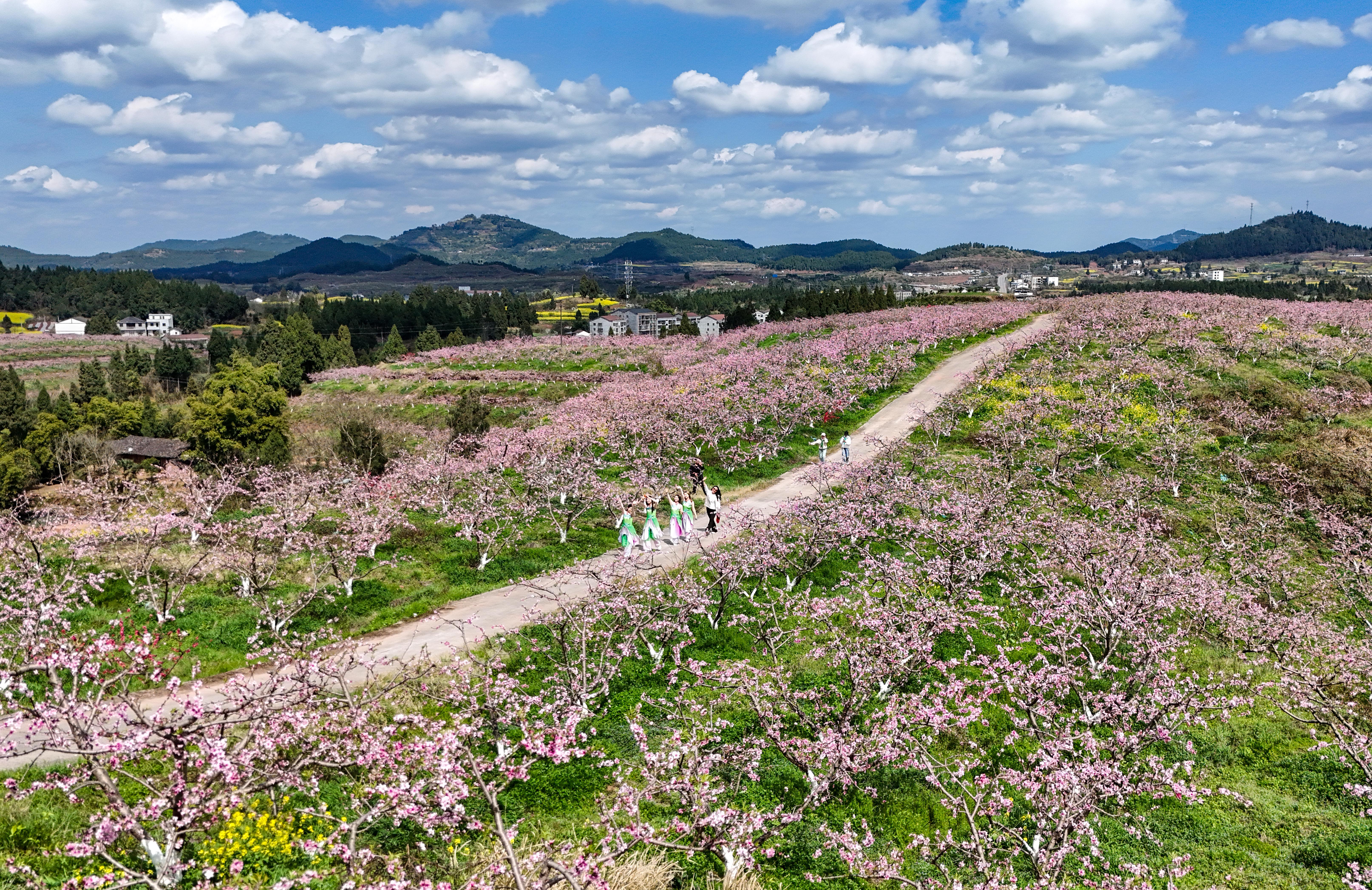 移步桃李产业园,粉白花瓣随风轻舞、落英缤纷,花海与青山绿水相映成趣。游客们或穿行花间打卡拍照,定格烂漫春光;或驻足品尝乡土美食、畅购农家土货,沉浸式感受田园浪漫与烟火气息;亲子游乐、田园漫步、民俗体验等多元业态,让春日乡村游更具吸引力。春日里的蓬安,正以花为媒、以节聚势,让“美丽经济”在田间地头绚烂绽放,为乡村发展注入强劲新活力,也让村民的幸福生活节节攀升。