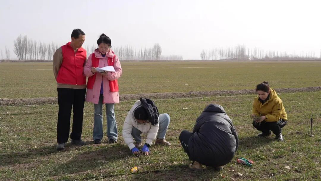农技人员正在小麦田里查看麦苗长势,仔细检测土壤墒情及病虫害情况。(孙季鸿 摄)