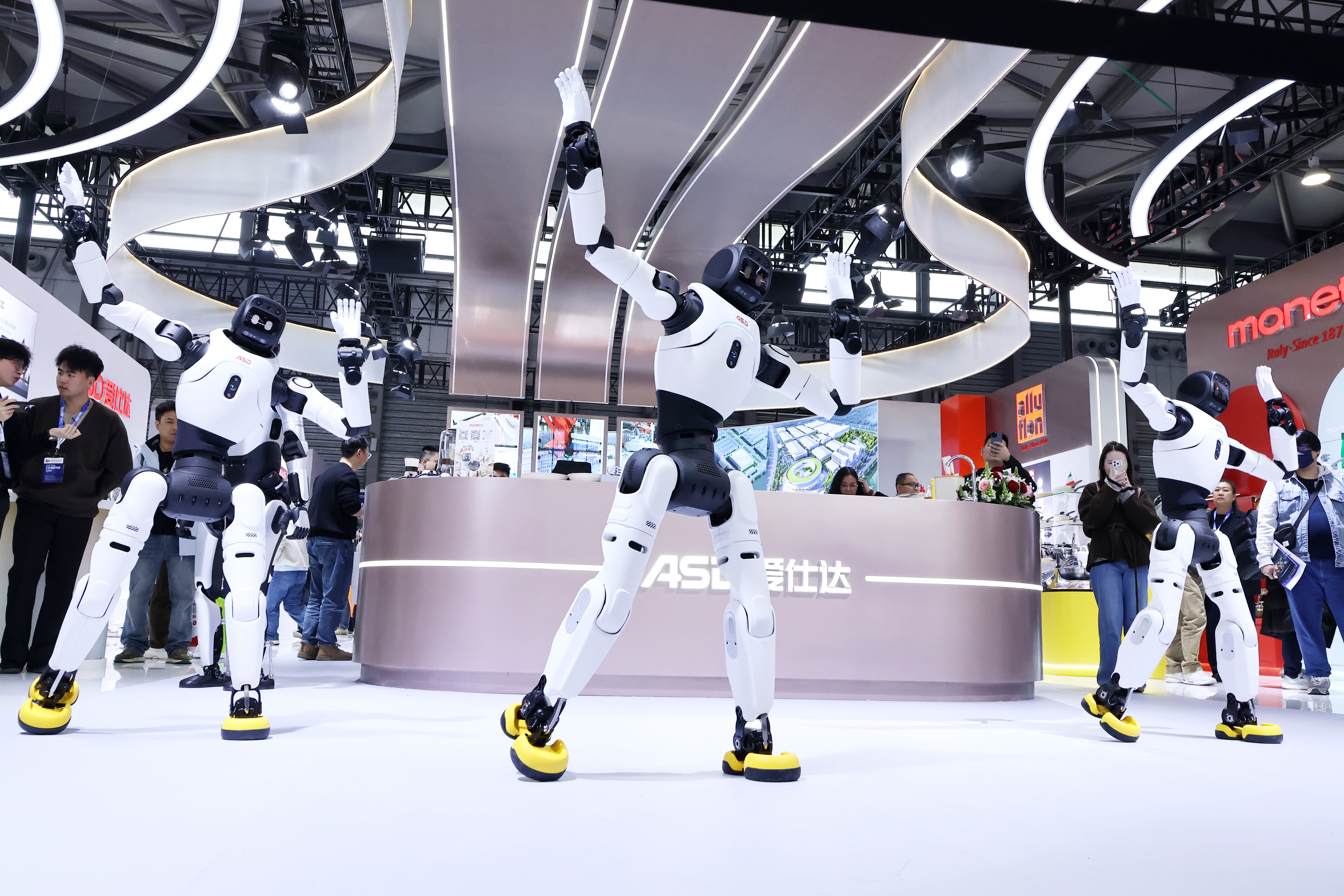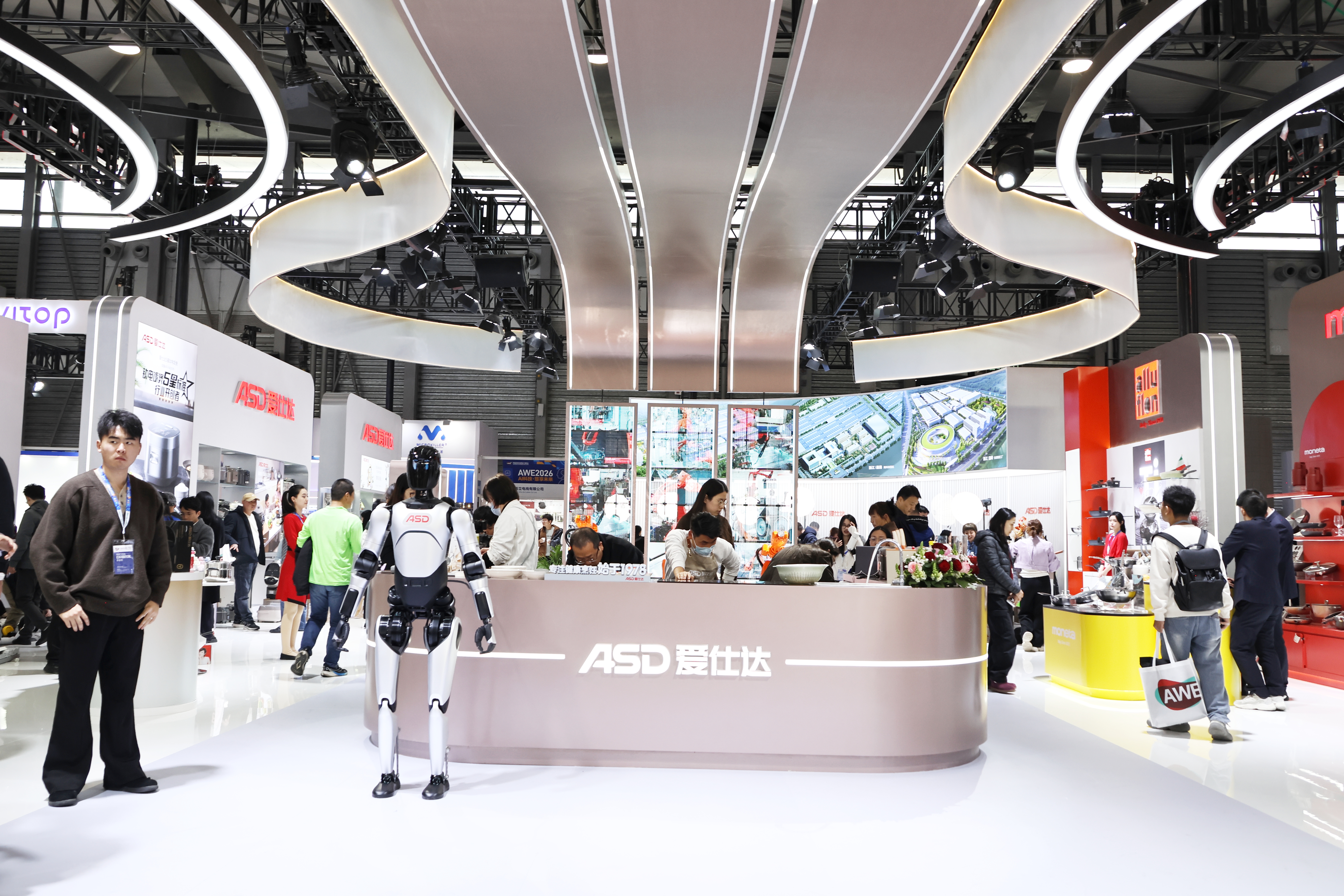 在深耕炊具领域的同时,爱仕达持续拓展科技边界。继2016年战略性切入工业机器人赛道后,此次AWE2026现场,爱仕达同步展示人形机器人领域布局决心,5台定制人形机器人集体展演。