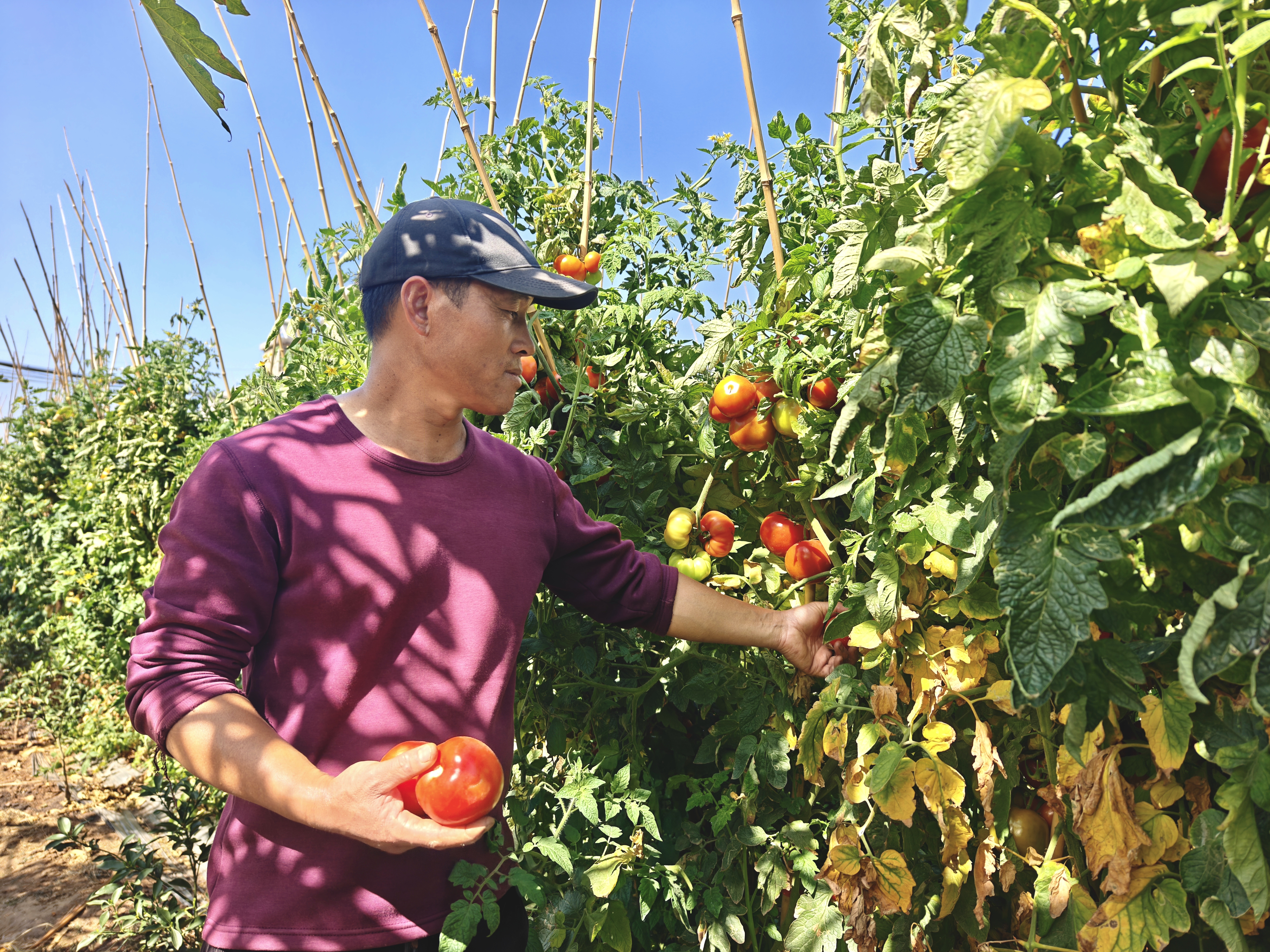 会东县大崇镇崇兴村坐拥金沙江干热河谷独特气候,光热充足、昼夜温差大,是发展特色果蔬的天然沃土。邹蔼福是这里土生土长的果蔬种植“土专家”,从事果蔬种植已有30余年。从普通农户到远近闻名的种植能手,他始终把技术钻研放在首位,常年扎根田间地头,摸索种植技术。为了种出高产、优质的西红柿,邹蔼福全程坚持标准化、精细化管理,采用双干整枝、每干留五苔至六苔果的科学方式,前期坐果后施用平衡肥,后期膨果期追施高钾肥和中微量元素肥,并配合氨基酸、鱼蛋白提升果实品质,通过一套适配本地的栽培技术,实现了产量与品质双提升。
