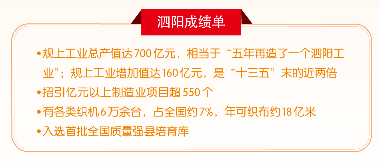 如今的泗阳演绎着从“一根丝”到“一件衣”、从“一棵树”到“一个家”的蝶变。高端纺织产业已经形成从聚酯切片到纺丝、加织、染整,再到成品加工的完整全产业链生态,汇聚了一大批行业龙头企业,链上规上企业达244家。全县共有各类织机6万余台,占全国约7%,年可织布约18亿米,占全国约6%,生产成衣家纺约1.5亿件(套),真正实现了从“织造”向“智造”的跨越。泗阳成功入选首批全国质量强县培育库,“2+3+N”特色产业体系的四梁八柱愈发稳固。