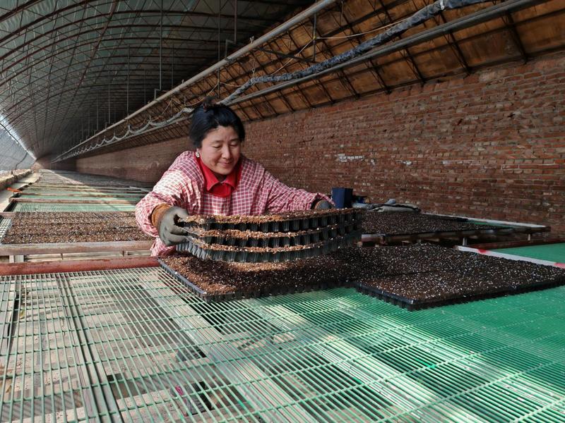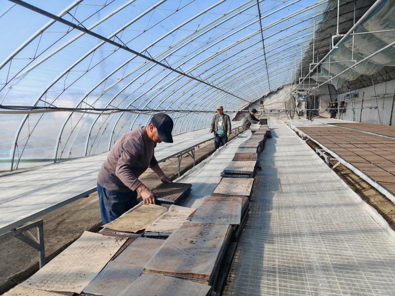 工人们将点好籽的穴盘放在育苗床上(高冰婵 摄)
