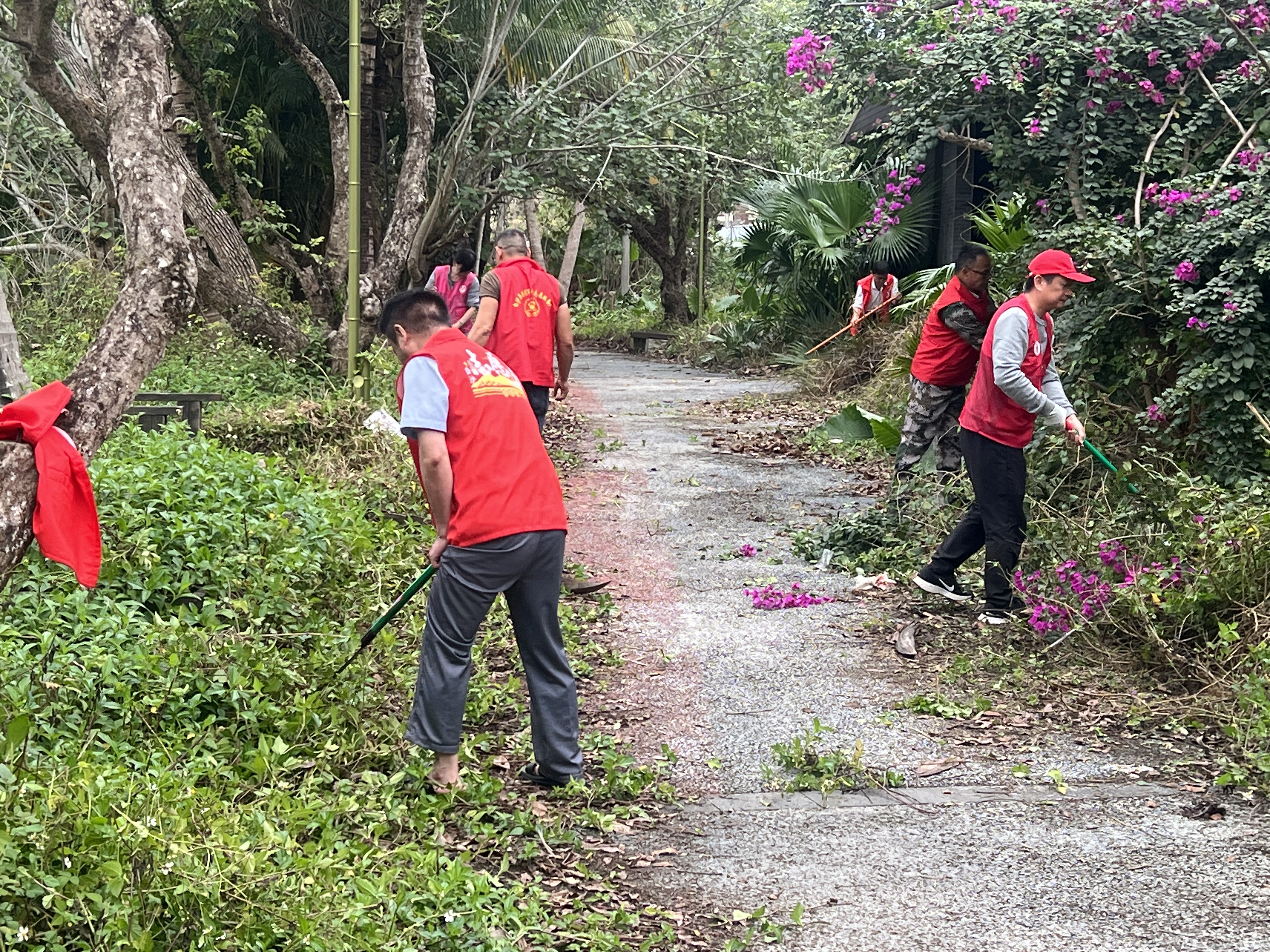 活动现场,全体参与人员以饱满的热情投入整治工作,充分发扬不怕脏、不怕苦、不怕累的实干精神,分工协作、高效推进,对湿地公园开展全方位、无死角的清理整治。针对步行道、中心广场及周边区域肆意生长的杂草藤蔓,工作人员手持砍刀、铁铲、铁耙等工具,逐一铲除顽固杂草、平整杂乱地块,彻底清理步道两侧、广场边角的卫生盲区;对路面、广场上堆积的落叶、散落的枯枝及各类杂物,大家用扫帚进行全面清扫、集中清运,确保路面干净通畅、广场整洁有序。