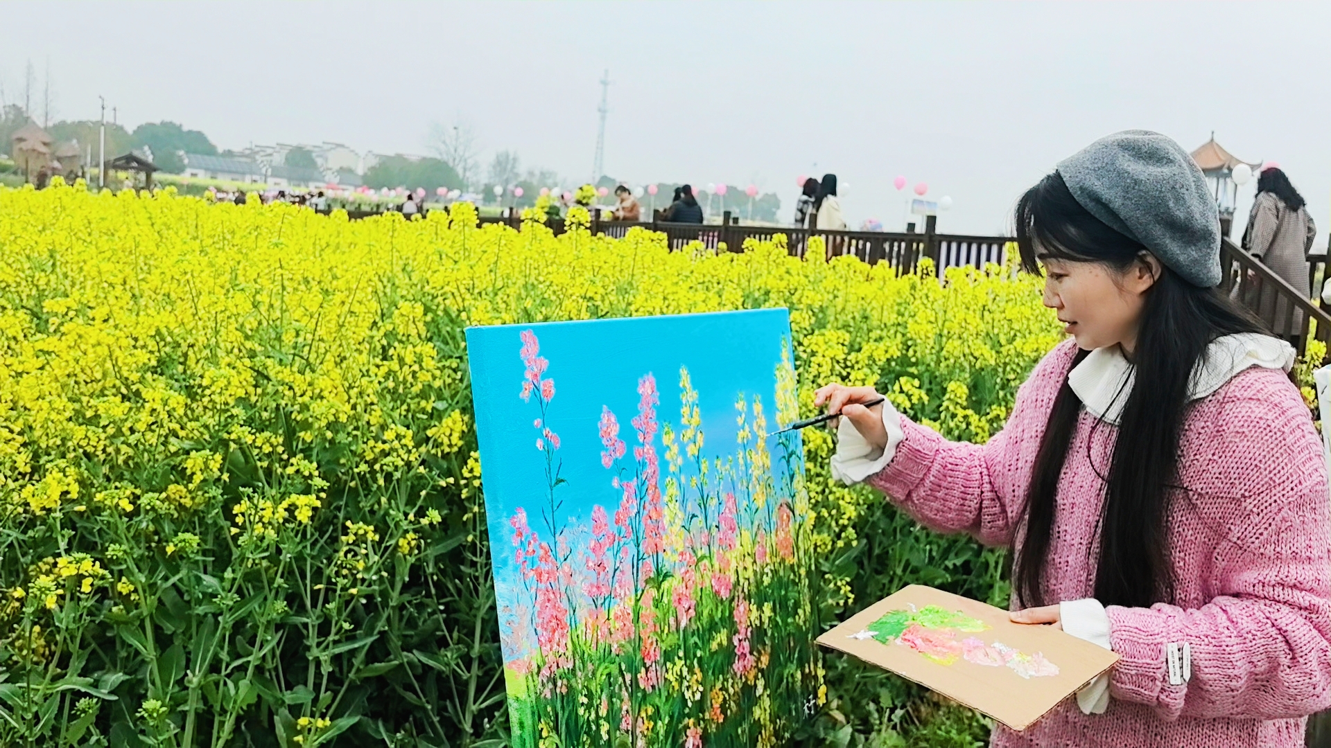 画家用画笔记录下油菜花海的美景(余惠玲 摄)