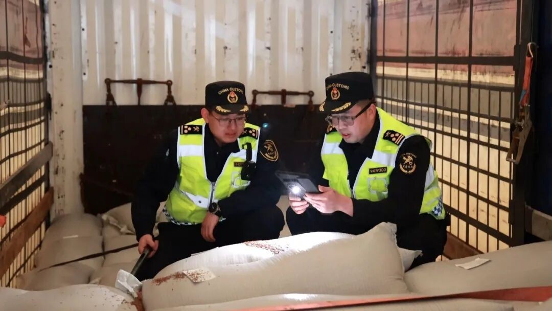 海关关员查验进口亚麻籽货物(格日乐图 摄)