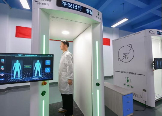 在安徽中科太赫兹科技有限公司技术研发室内,科技人员正在调试太赫兹人体安检设备。(赵明 摄)