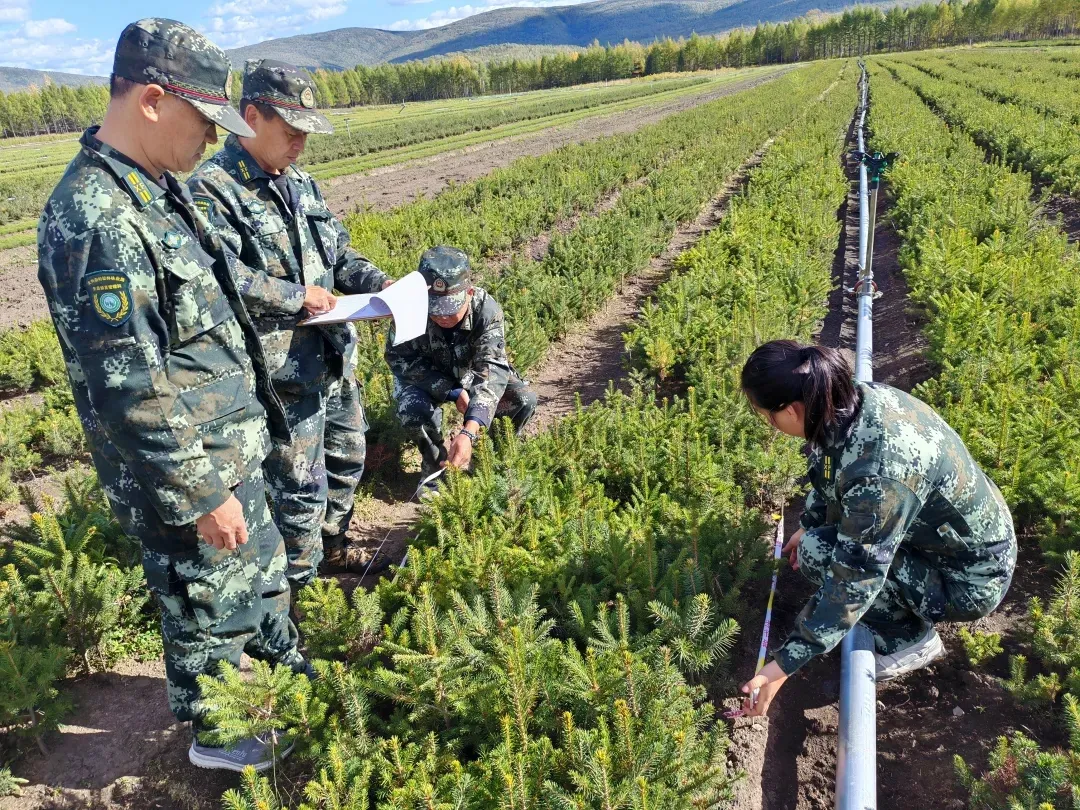 新林林业局中心苗圃技术人员正在记录种苗生长情况(崔红霞 摄)