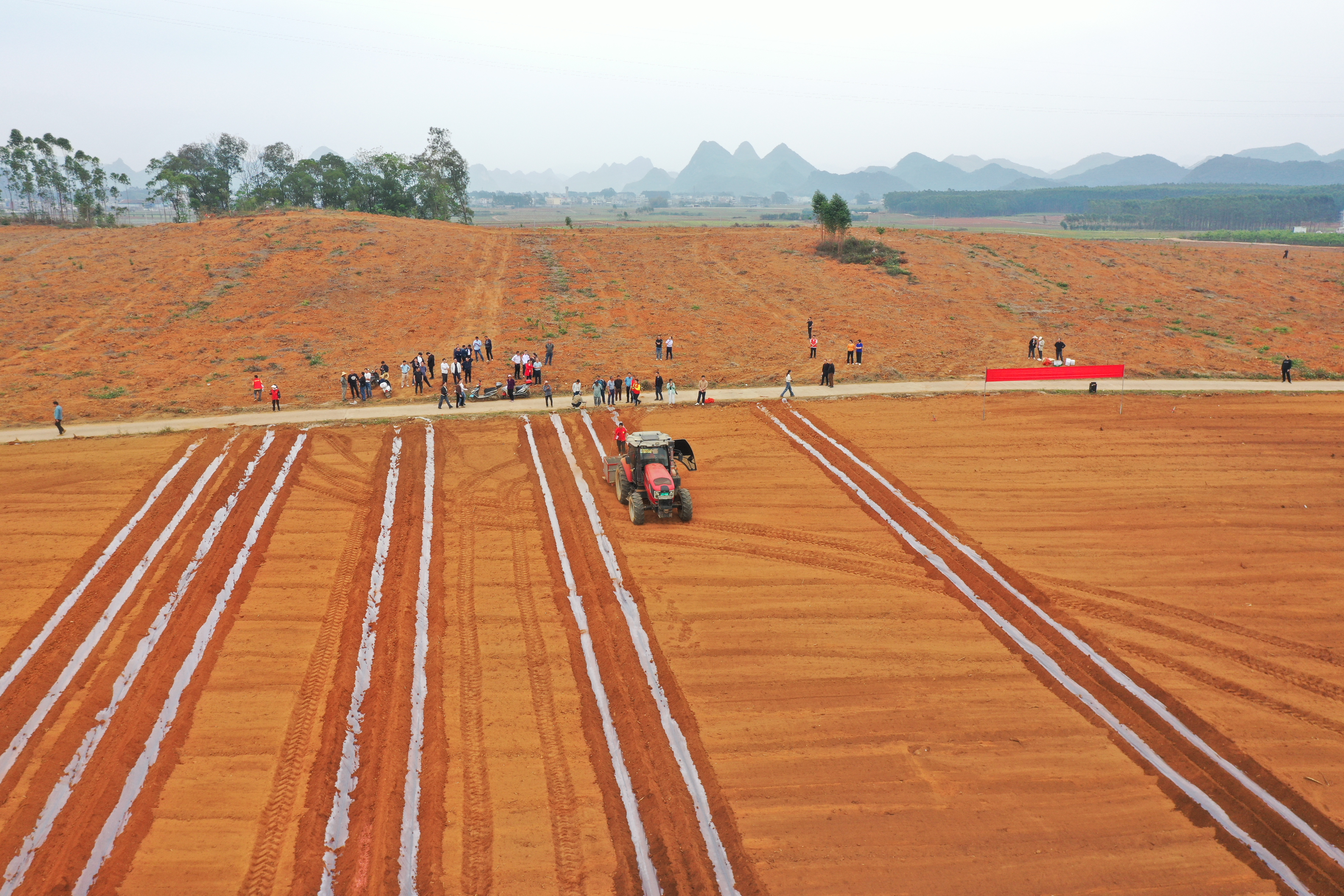 3月19日,在广西武宣县思灵镇高岭甘蔗种植农民专业合作社的种植基地,机器轰鸣,数台“铁牛”正在抢抓晴好天气,紧张有序地忙碌着,对土地进行挖沟、耙地等作业,泥土翻涌成金黄的波浪。搭载北斗导航的无人种植机,将一段段甘蔗种规范的放在预定位置,同时按要求盖上“保护膜”,从空中往下看,仿佛为大地绘出一条条清晰的“脉络”。机器的轰鸣声、耕作的顿挫声交织,奏响了最激昂的春天序曲。这是武宣县农机助春耕的实践实景。
