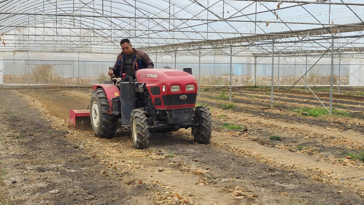 武宣县桐岭镇四安村村民正在驾驶农机耙地(向国华 摄)