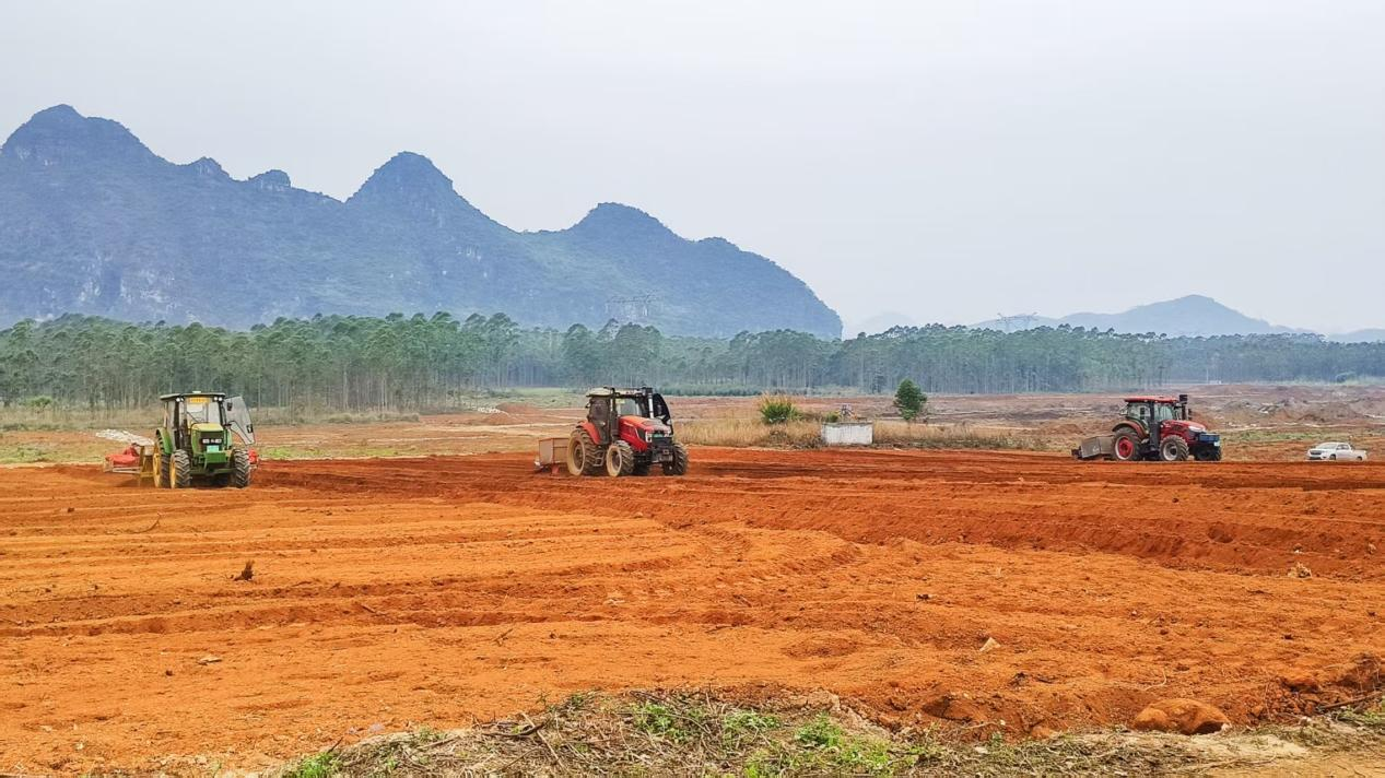 武宣县思灵镇高岭甘蔗基地里,农机助力春耕生产一幕。(向国华 摄)