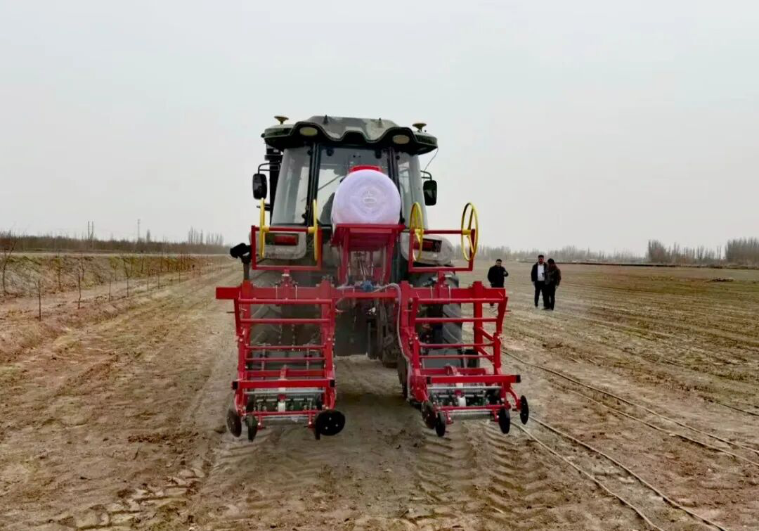 3月19日,在新疆沙雅县努尔巴格乡苏盖提托喀依村种植户孙峰的小麦地里,一台集“旋耕、铺膜、滴灌带、封闭药、打孔”于一体的新型农机正在进行下线测试。伴随着机器的轰鸣声,旋耕刀片翻起泥土,地膜平整铺开,滴灌带精准埋入,一系列作业一气呵成。这台专为“小麦+”套种模式研发的多功能一体机,即将奔赴田间地头,为即将开始的辣椒移栽做好准备。种植户孙峰蹲在田埂边,仔细查看苗情。再过一个月,他就要在这片麦田里套栽辣椒苗。