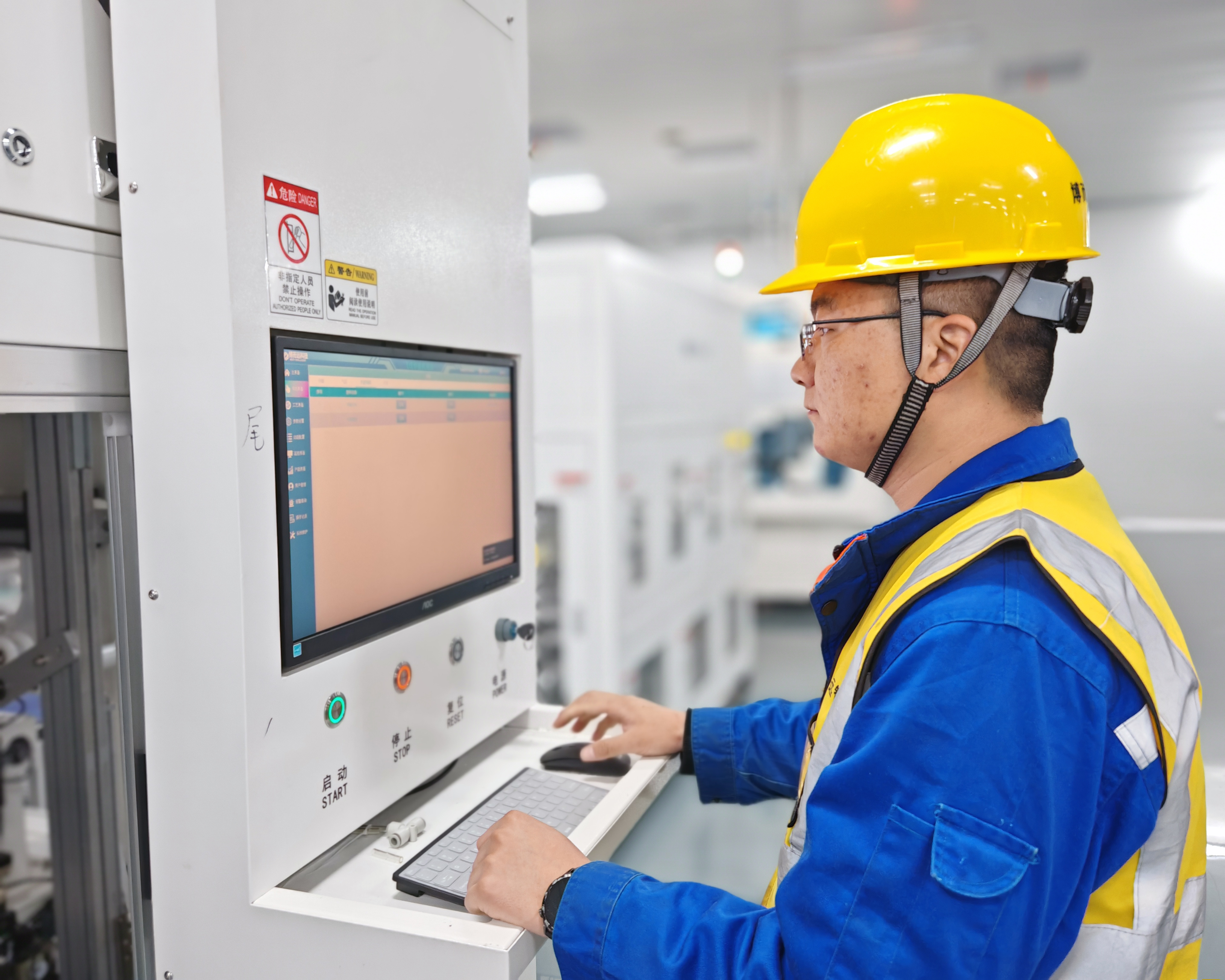 琏升光伏异质结组件生产项目现场,工人正在调试机器(罗俊涵 摄)