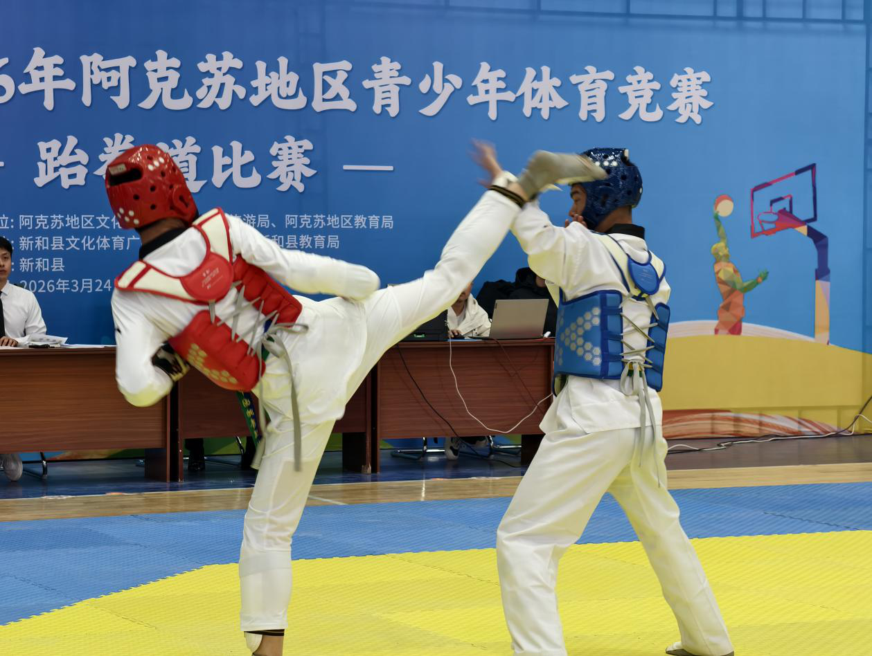 3月24日,“奔跑吧·少年”2026年阿克苏地区青少年系列体育竞赛跆拳道比赛在新疆新和县文体中心正式启幕。来自全地区各县(市)的青少年参赛选手、教练员及裁判员齐聚一堂,以赛场为台,用汗水诠释体育精神,共同展现阿克苏青少年朝气蓬勃、奋勇争先的青春风采。
