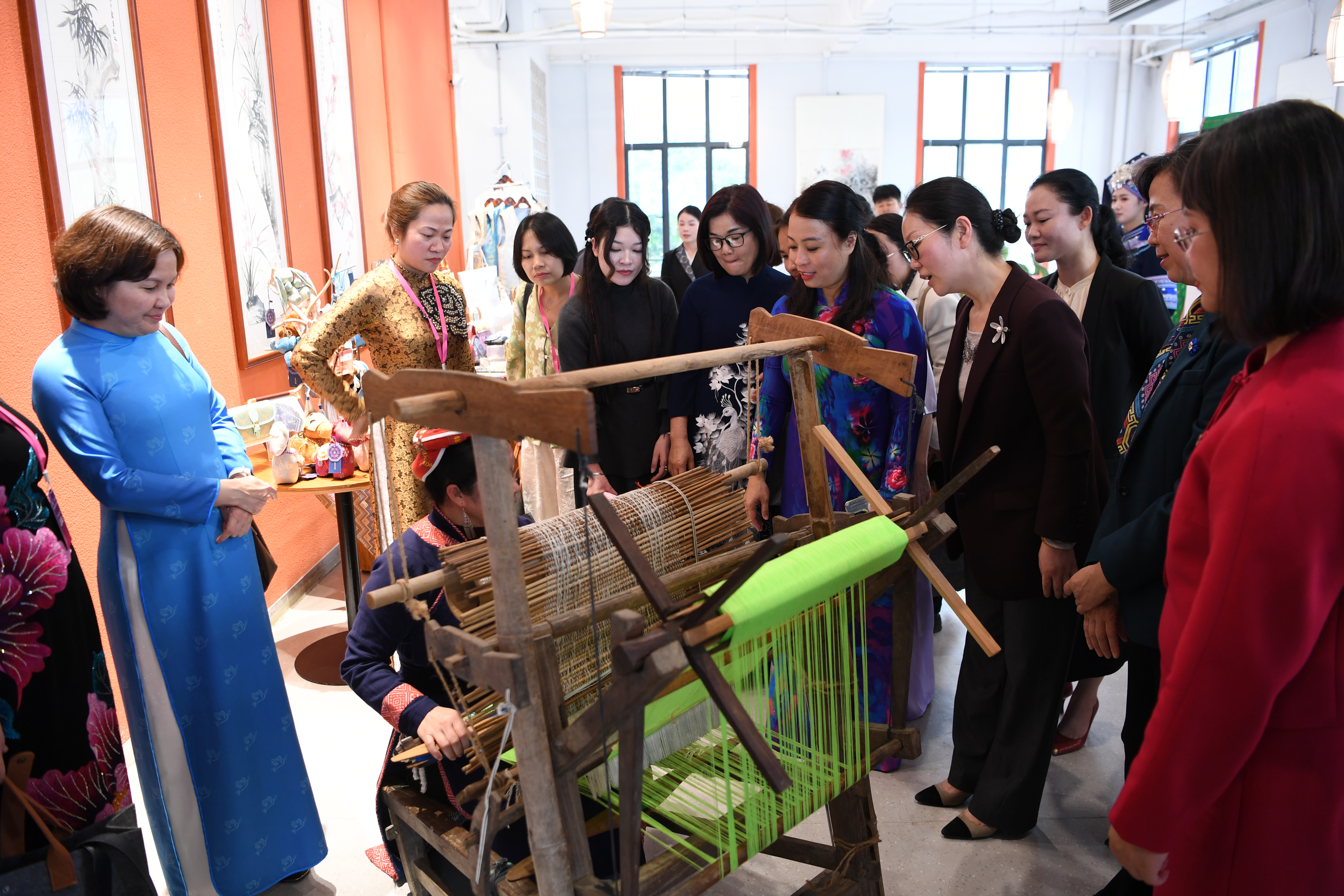 启动仪式后,系列特色交流活动依次开展,中越姐妹在互动中拉近距离、增进认同。在友谊关中外文明交流中心,“锦绣边关 巾帼同心” 非遗手工制作活动温馨启幕,中越妇女代表携手制作壮锦小马,在一针一线中感受中华优秀传统文化的魅力,结下深厚友谊;现场还设置了中越特色美食区,双方代表品尝特色茶点,在味蕾的交融中体味民心相通。
