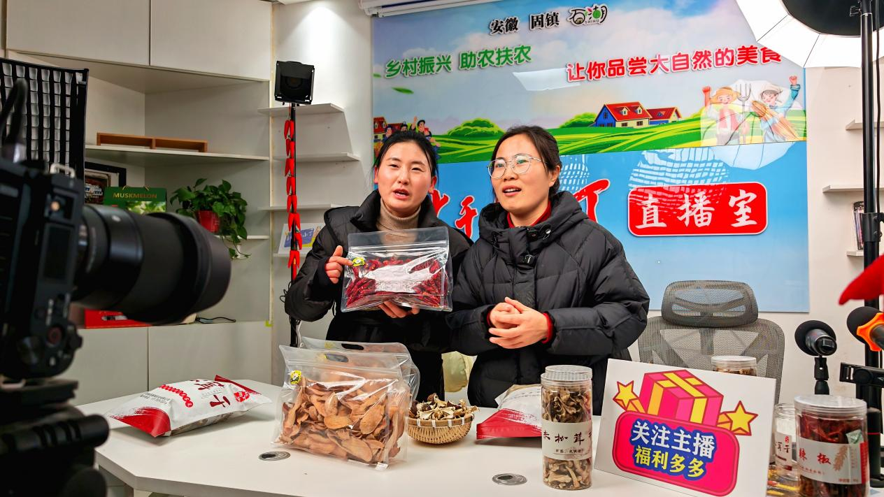 傍晚六点半,安徽固镇县石湖乡康湖村村委会的和美乡村直播间里,补光灯准时亮起。村党支部书记丁秀荷拿着提前准备好的资料,面带笑容地站到手机镜头前,桌子上摆满赤松茸干、干辣椒、红薯粉丝等村里的“网红”农产品。