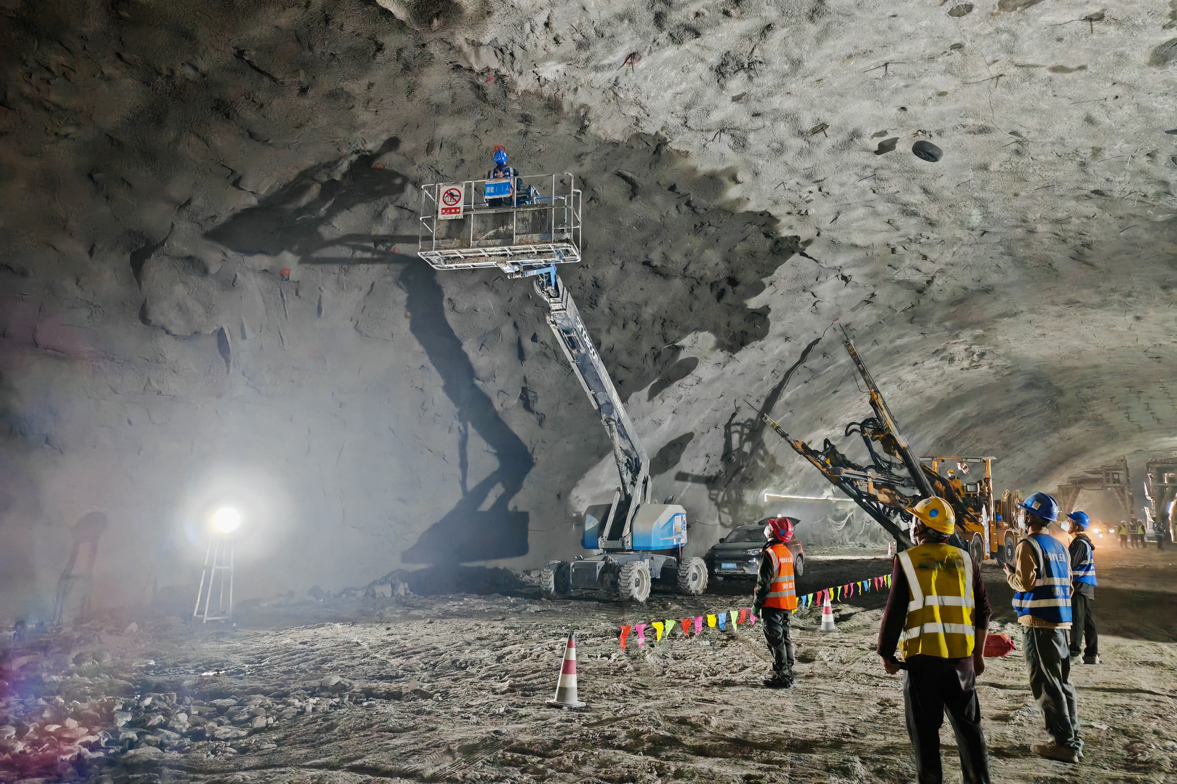 施工人员正在对地下厂房顶部进行支护锚杆测绘放样 (苏波 摄)
