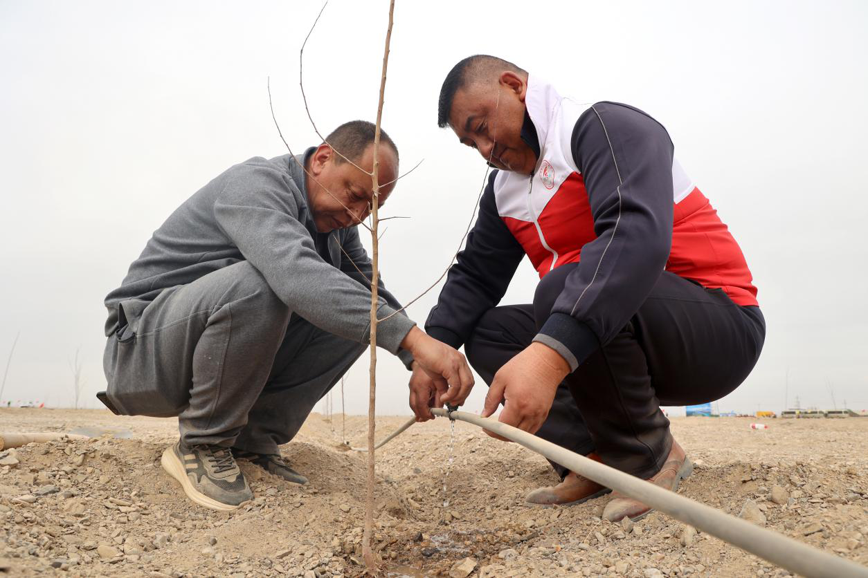 “树苗再埋深点,填土时要夯实……”乌什县林业和草原局工作人员麦合木提·莫敏不停地穿梭在自己负责的片区进行技术指导。为确保植树质量,提高树苗成活率,乌什县林业和草原局抽调了65名技术人员进行现场指导。植树活动分工明确、配合密切,志愿者们对照栽植标准,扶直苗木、挖坑铲土、踏土夯苗,确保栽种的树苗间距相等、整齐排列。