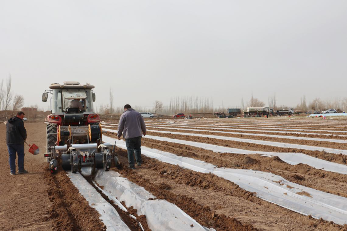 3月25日,新疆库车市伊西哈拉镇龟兹二村的农田中,覆膜、施肥、开沟、打孔一体化农机穿梭作业,一排排整齐的瓜垄在阳光下铺展。