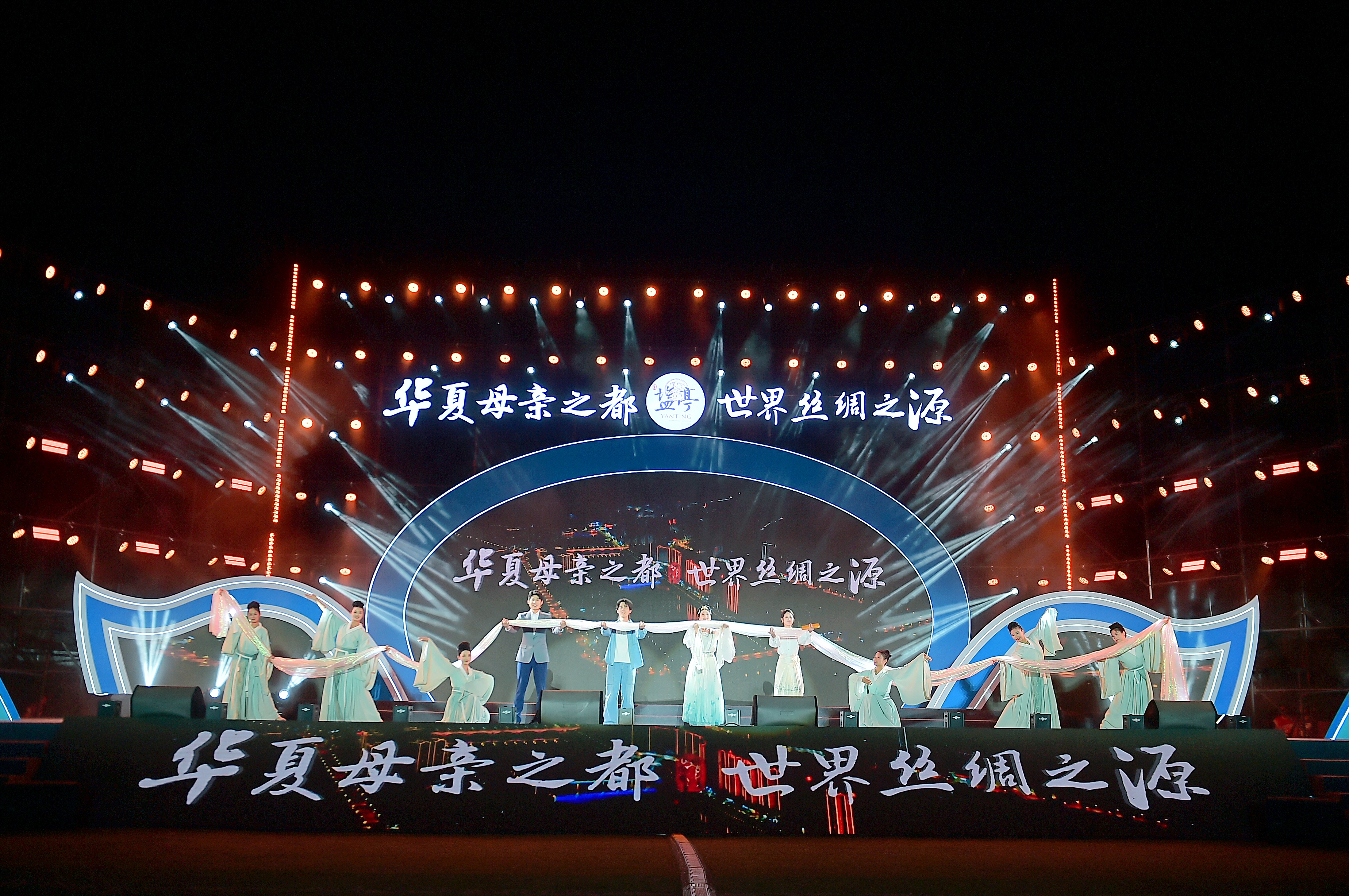 女声独唱《凤凰的家乡》、古典群舞《丝韵千年》、两岸童声合唱《蚕神谣》、歌曲联唱《两岸同声》重现了嫘祖始蚕的古老传说,诉说对人文女祖最纯真的敬意。大型舞蹈《丝路·神灯》、器乐协奏《弦音竹影》、沉浸式情景讲述《织光者》展现了中华文化的包容与深邃,礼赞了新时代的奋斗精神。说唱·旗袍秀《盐亭风物》、组合表演唱《万疆赤子心》生动展示了盐亭的独特风物与时代新貌,表达了深厚的家国情怀和对祖国繁荣昌盛的真情祝愿。文艺汇演在大型歌舞《光芒》中达到高潮并圆满落幕。