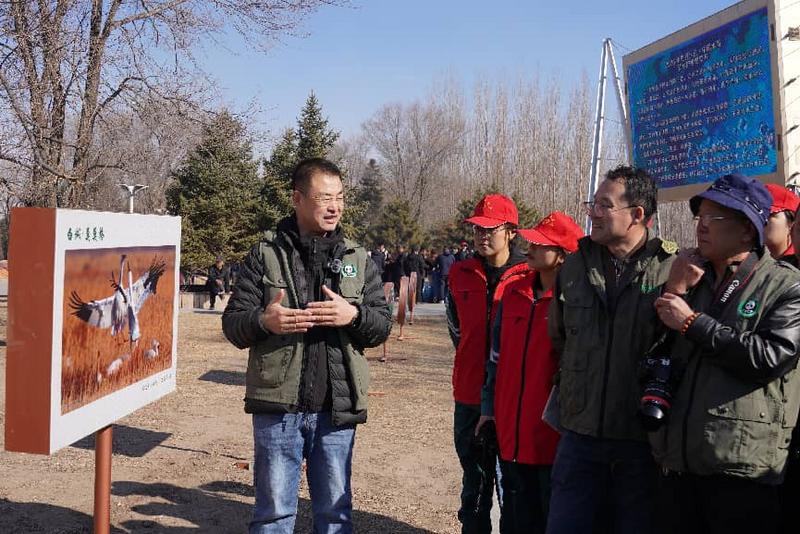 “护飞队”志愿者在活动现场介绍图片背后的生态故事活动(王凯 摄)