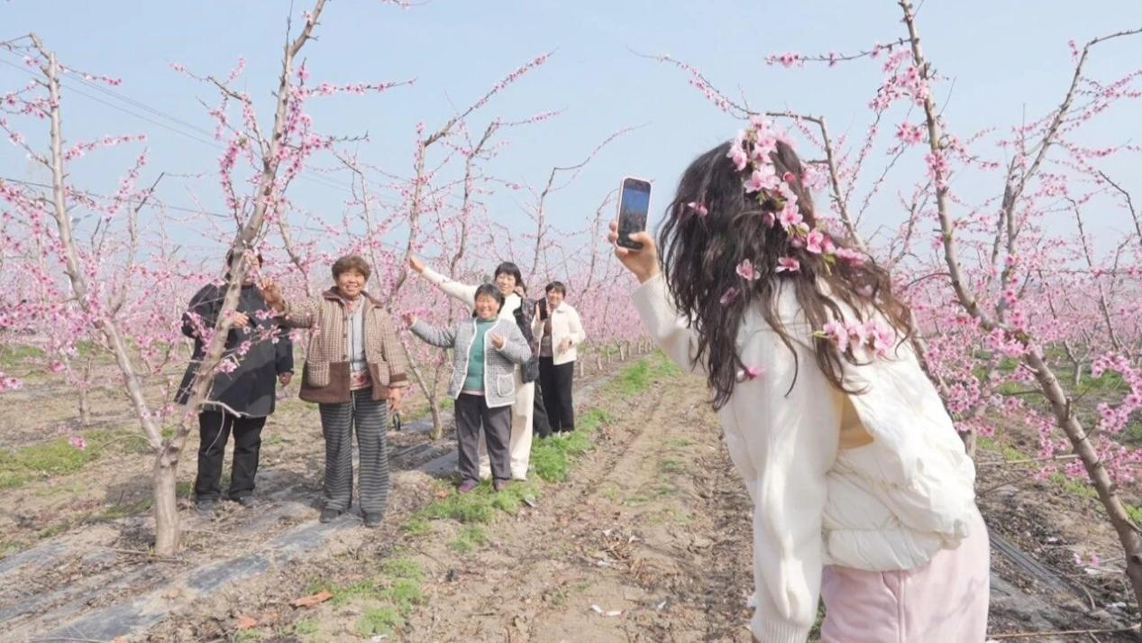 走进位于怀远县陈集镇瓦四村的年耀家庭农场,连绵的桃树竞相吐蕊,层层叠叠的花海将田间染成了一片粉红。不少游客慕名而来,穿梭在花树下拍照打卡,享受春日里的浪漫时光。游客王梦春说:“在网上看到别人发的桃园照片,特意开车过来玩一玩。”游客张建芳说:“我和几个老姊妹年年来拍桃花,今年桃花开得特别好!等冬桃成熟的时候我们也来摘!”