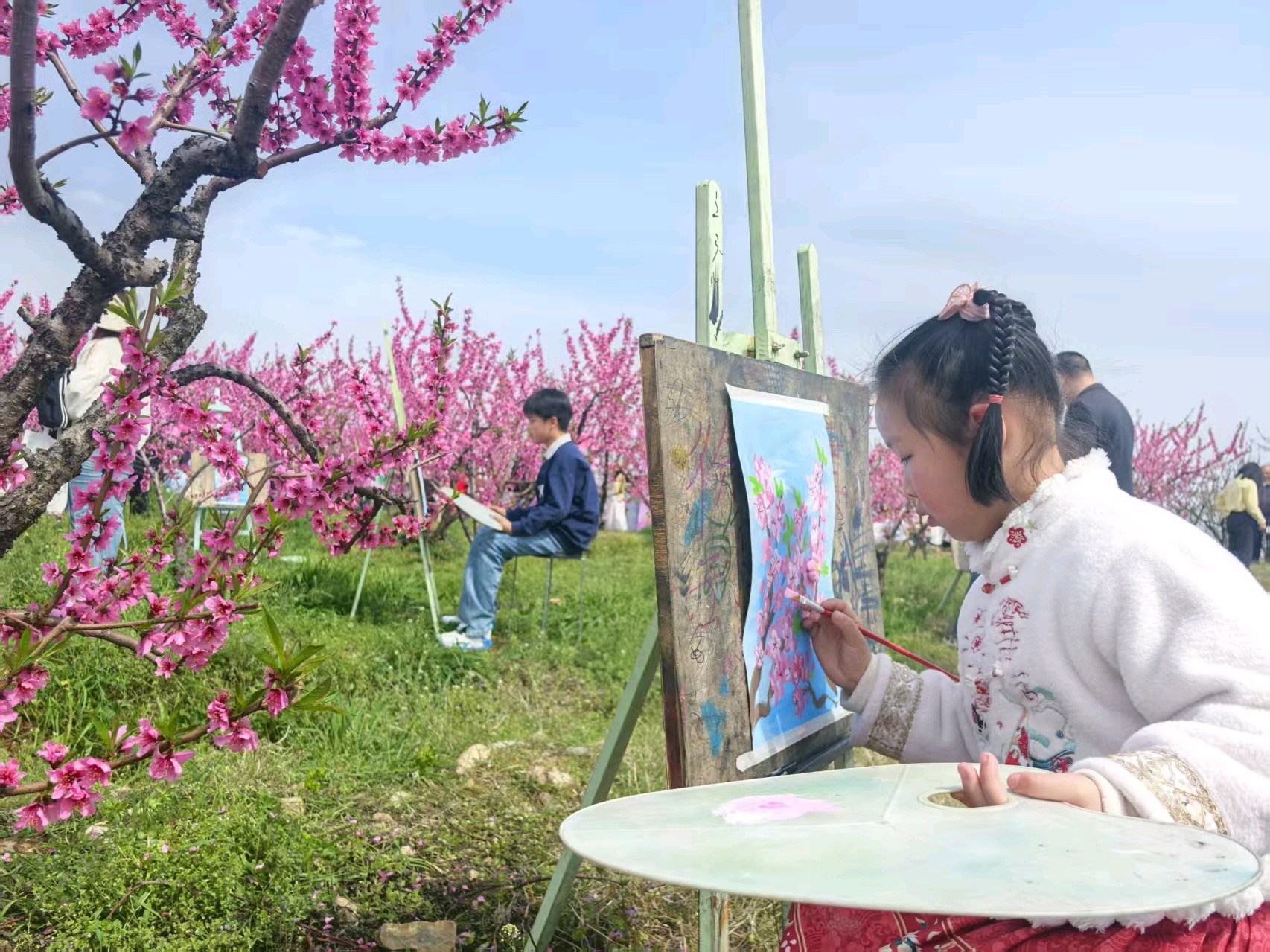 3月28日,在湖北省枣阳市熊集镇熊河村优质桃种植区,漫山遍野的桃花沿着山势铺展开来,粉红交错、争奇斗艳。漫步桃林间,市民游客拍照打卡,不少小朋友以花为景,现场作画,用画笔绘就美丽的春天。