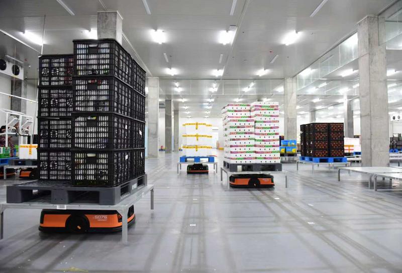偌大的仓储车间里,只有寥寥几名工作人员守在液晶屏前;一台台AGV机器人(自动导引运输车)托举着成筐的辣椒、苹果等果蔬,自由穿梭,精准送到分拣台……