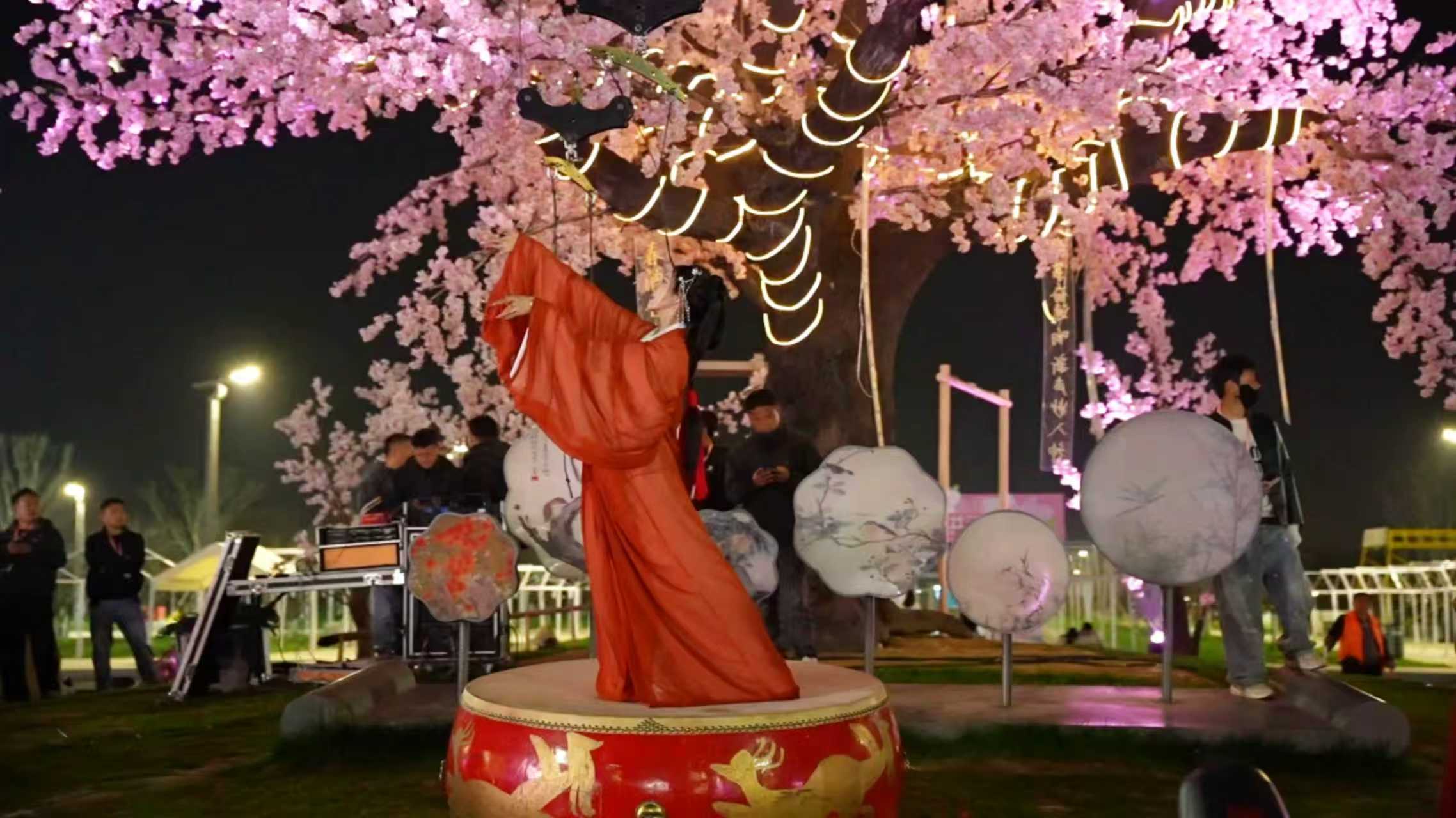 开园当日,景区内游人如织、氛围热烈。巨型鳌鱼灯巡游气势恢宏,十里红妆汉婚大典、县衙沉浸式情景演艺、凤求凰主题演艺秀轮番上演;赛博机甲天团全园巡游互动,古今碰撞、新意十足。夜幕降临,霸王虞姬高空威亚秀、楚汉争雄非遗铁花秀、天女散樱花高空威亚秀在樱花环岛惊艳亮相,璀璨光影与漫天樱雪交相辉映,现场掌声、欢呼声不断。