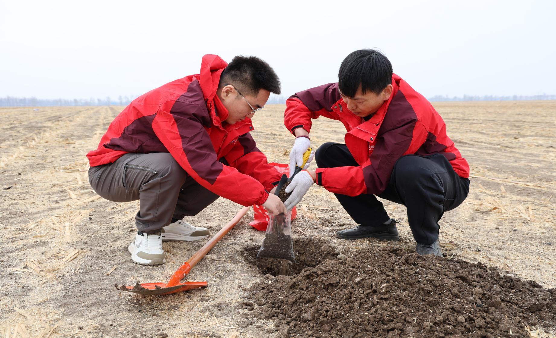 粮食生产,土是关键。在开鲁镇小城子村玉米种植地块,开鲁县现代农事综合服务中心农服部负责人刘国伟正和同事在不同点位挖土、测冻层深度、取样。
