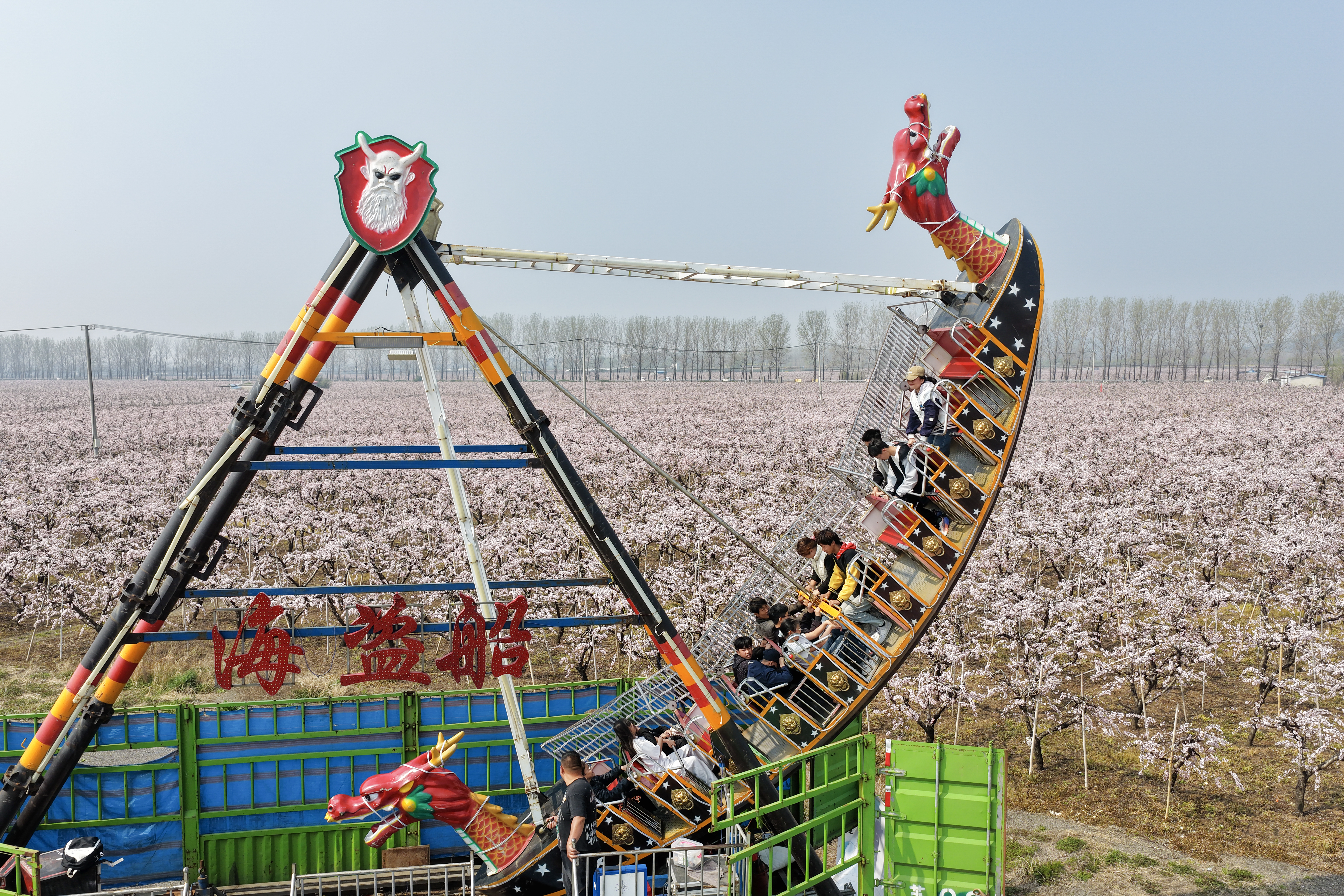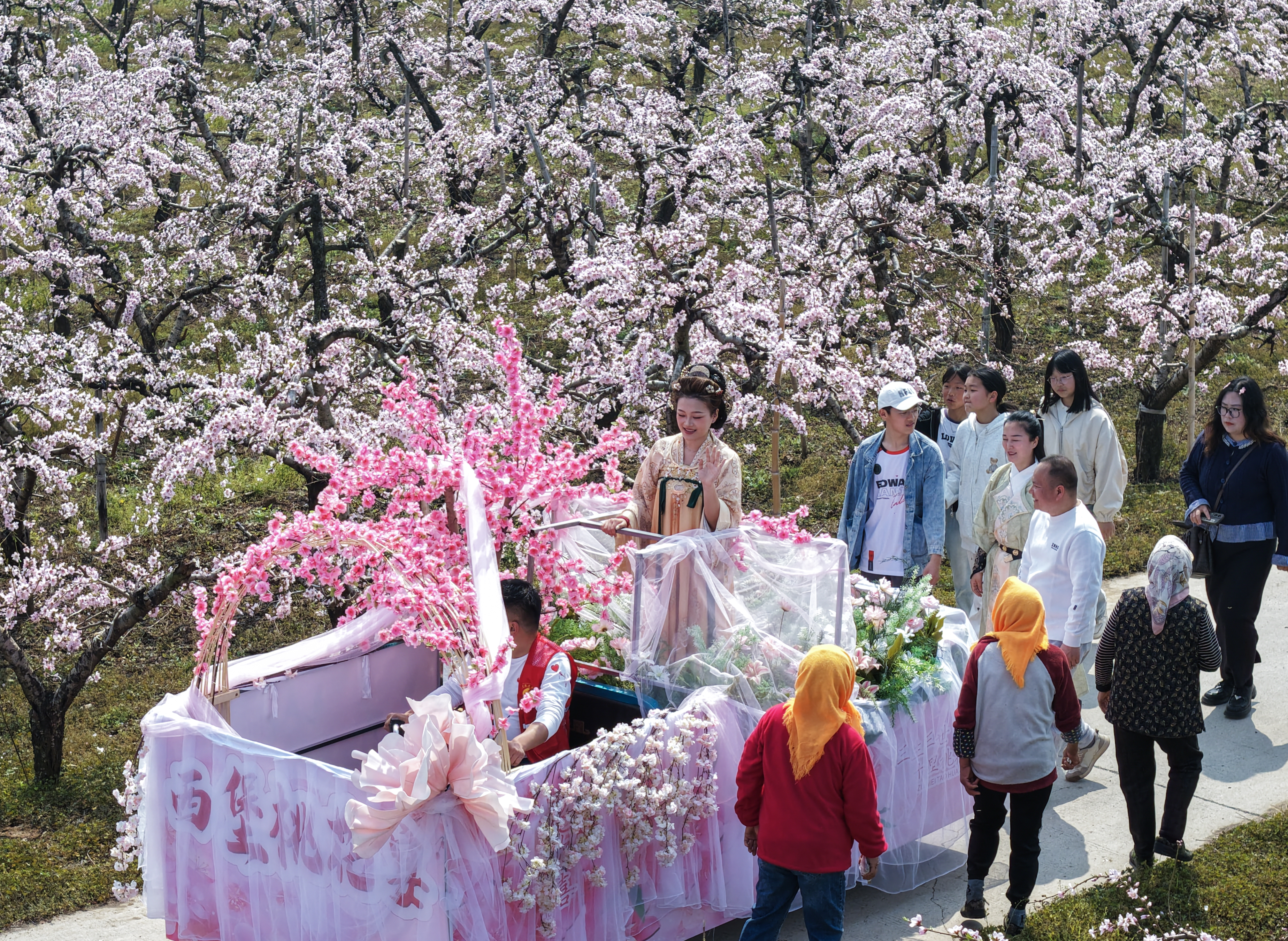 2026年4月1日,江苏省徐州市铜山区柳泉镇西堡万亩桃花盛放,游园会启幕,花车巡游、汉服打卡引游人共赏春日盛景。(记者 张伟伟)