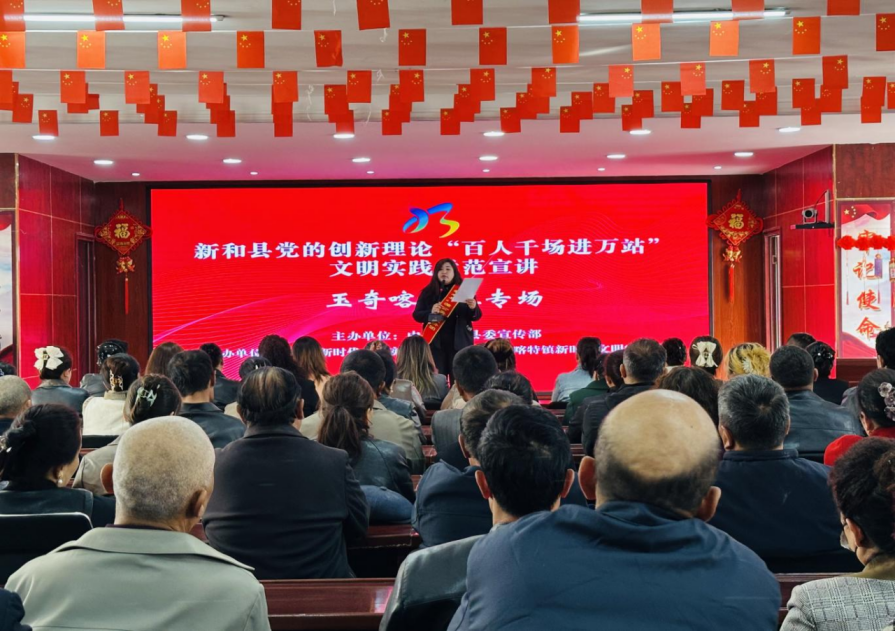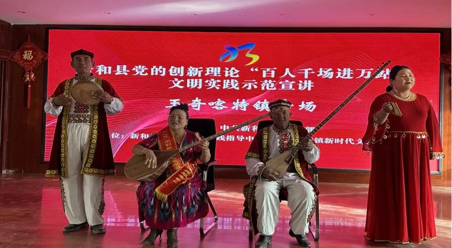 3月30日,新疆新和县党的创新理论“百人千场进万站”文明实践示范宣讲在玉奇喀特镇举行。宣讲团以群众喜闻乐见的形式,将全国两会精神和党的惠民政策送到群众身边,通过理论宣讲、互动问答、文艺表演相结合的方式,推动党的创新理论落地生根、深入人心,凝聚起全镇各族群众团结奋进、共建家园的强大合力。