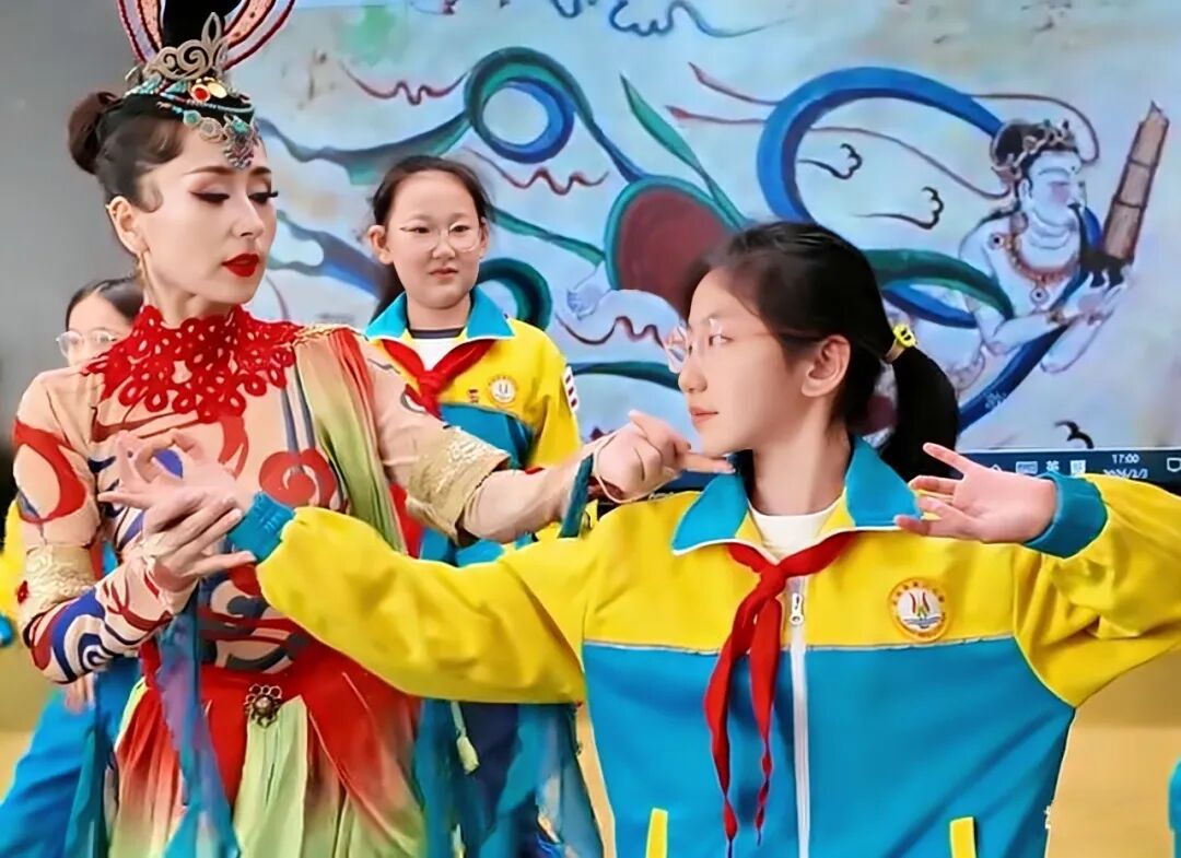 在校园里,龟兹手势舞融入日常课堂。克孜尔石窟壁画中的经典动作被提炼改编,结合青少年认知特点编排成手势舞,由克孜尔歌舞团专业舞蹈老师亲自教授,让千年壁画中的美学与故事在青少年心中生根发芽。“每一个动作都源自石窟壁画,老师还会边教边讲壁画里的千年故事。”拜城县第二小学学生刘玉鲲说道,如今她已在手势舞中渐渐爱上家乡的龟兹文化。