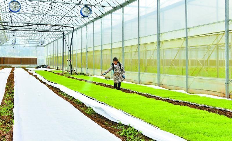 仪陇县育苗中心的大棚里工作人员正在为秧苗喷药 (汪泽宇 摄)