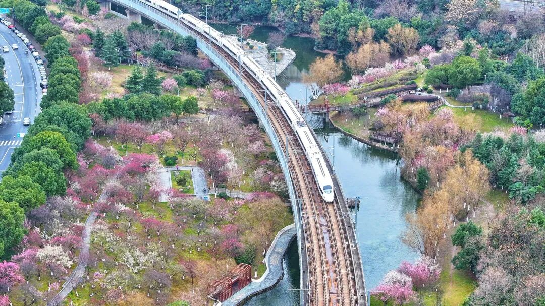 江淮大地,春意铺卷。合肥匡河两岸,梅林连绵成片,红梅粉梅缀满枝头,列车穿行花间,构成一幅灵动的春日长卷。