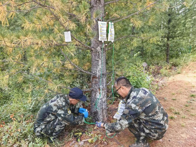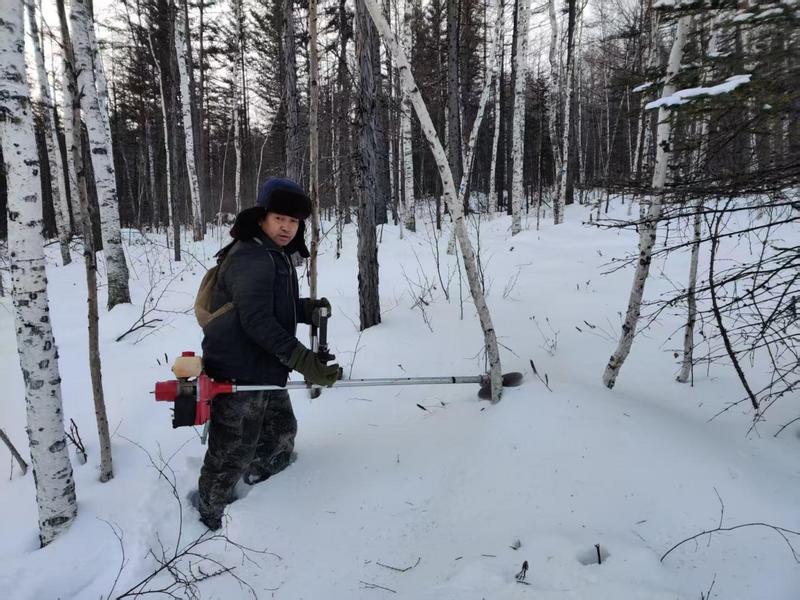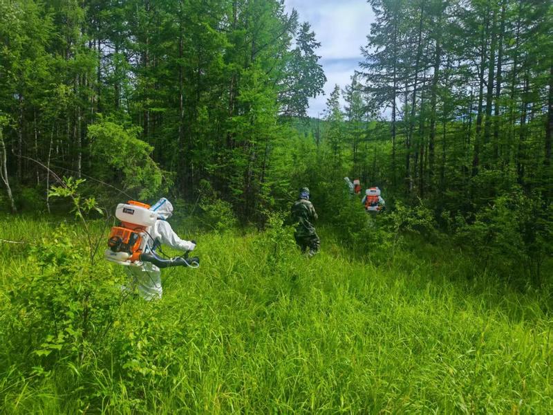 林业局技术人员在开展西伯利亚红松专项防治工作(王微 摄)