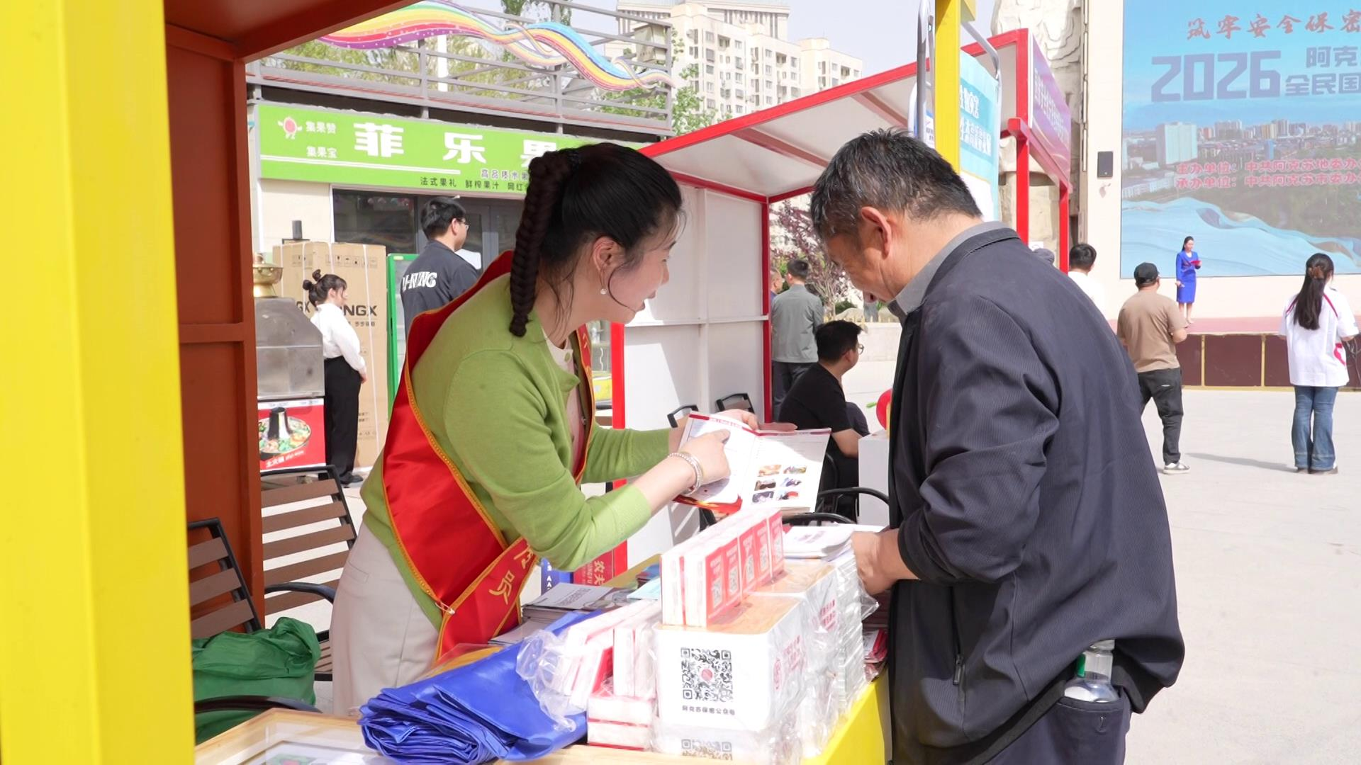 活动现场,工作人员正在向过往群众宣传总体国家安全观相关知识(帕孜丽亚·托乎尼牙孜 摄)