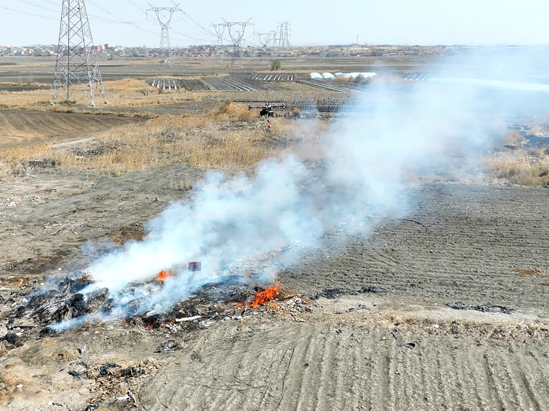 当日11时,国网新疆电力运维人员通过线路在线监测系统,发现750千伏乌格一线037号至038号杆塔间廊道出现烟火告警,立即启动应急响应,携带大载重无人机及专用灭火弹赶赴现场。作业人员快速完成设备调试、航线规划后,操控无人机升空抵达火情区域,依托实时传输画面精准锁定火点,平稳投放4公斤专用灭火弹,灭火弹落地后迅速覆盖火情区域,单枚有效灭火面积达9平方米,现场火势即刻得到控制,线路安全隐患被彻底消除。