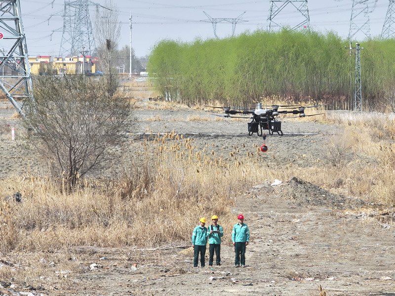 4月7日,新疆送变电公司员工在750千伏乌格一线应用大载重无人机进行灭火作业。(彭森 摄)