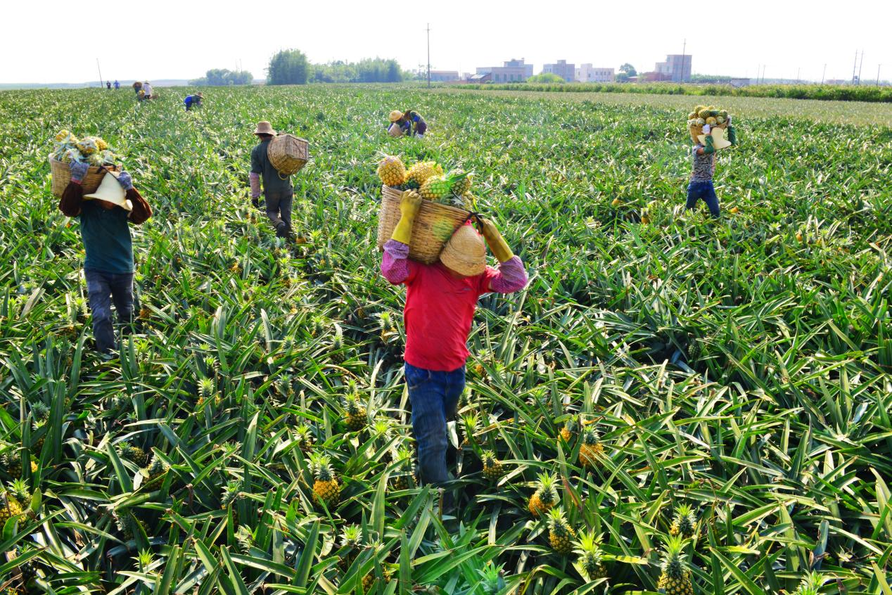 徐闻菠萝种植户在田间采摘搬运菠萝(王策铭 摄)