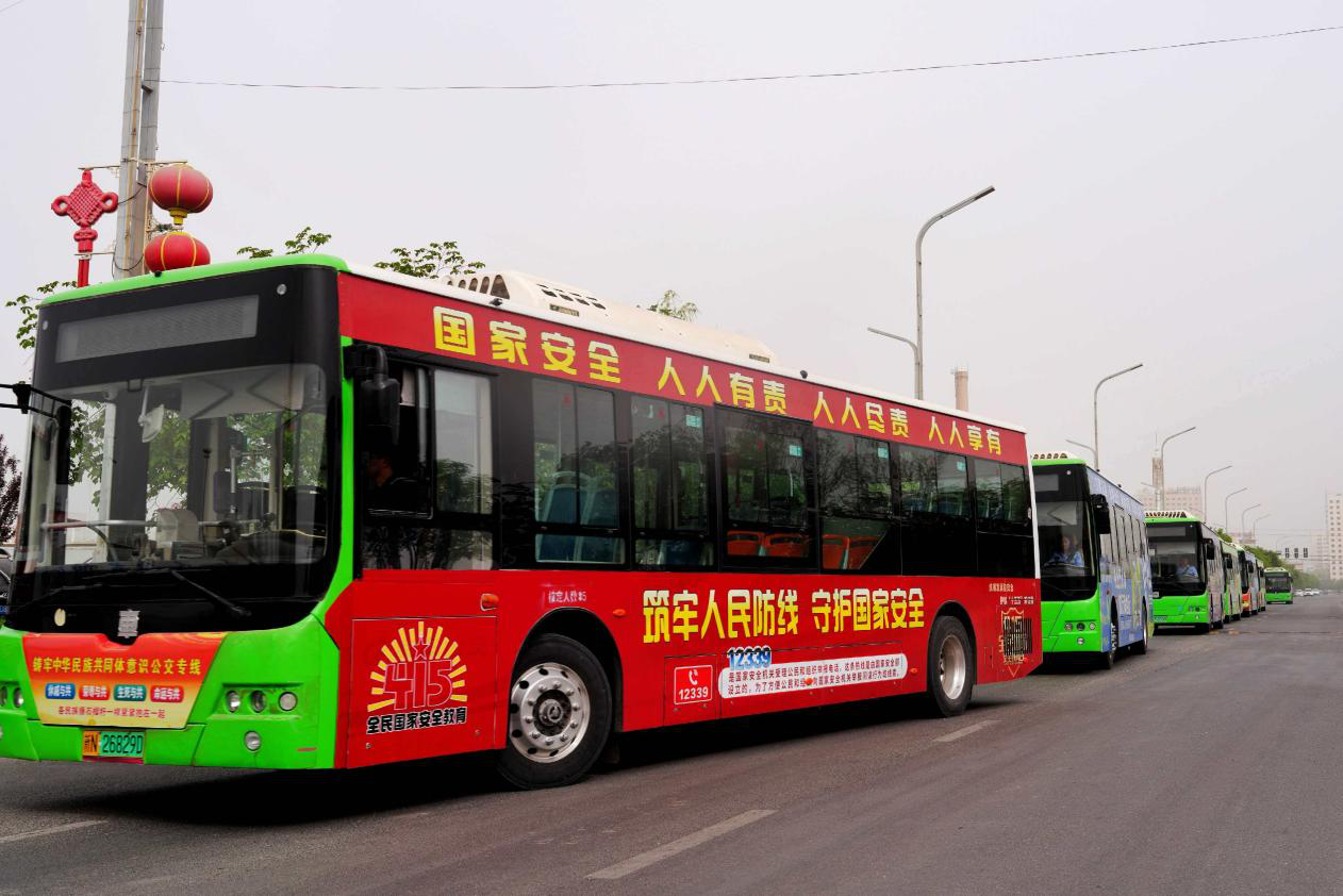 仪式现场,8辆主题公交车整齐列队,整装待发。车体上“筑牢人民防线、守护国家安全”等宣传标语,在中国红的映衬下视觉鲜明、主题突出;车厢内设置宣传展板、摆放宣传手册,车载电子屏循环播放总体国家安全观、网络安全等宣教视频。市民乘车出行时,可通过多形式、全方位的载体学习国家安全知识,实现国家安全宣传从“静态展示”向“动态传播”转变,构建“车厢小阵地、宣传大舞台”的高效宣教模式。