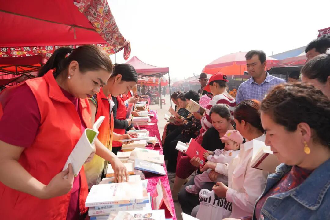 此次活动精准对接基层群众多样化阅读需求,在巴扎现场精心搭建流动书屋展台,集中摆放政策解读、农业技术、科普知识、少儿读物、文学经典等各类优质书籍,全面覆盖不同年龄、不同群体的阅读喜好,切实满足群众多元文化需求。活动现场,借阅体验、读书打卡、好书分享等互动环节有序开展,乡干部、人大代表与志愿者主动上前,热情引导赶集群众驻足翻阅、沉浸式感受阅读乐趣,鼓励大家现场交流读书心得、分享阅读感悟,让巴扎上的书香氛围愈发浓厚。