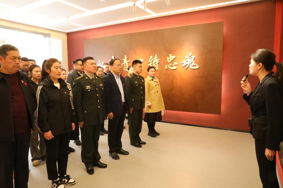 在十八勇士浮雕前,全体肃立默哀。一场深刻的实景思政课随即展开——区委党校老师李文汇深情讲述青口十八勇士血战到底、宁死不屈的壮烈事迹。从抗日战争、解放战争到抗美援朝,那面“青口十八勇士”的战旗始终高高飘扬,英雄连队的血脉从未断绝。授课结束,全体人员面向浮雕,举起右拳,重温入党誓词,铿锵誓言激荡在每个人心中。