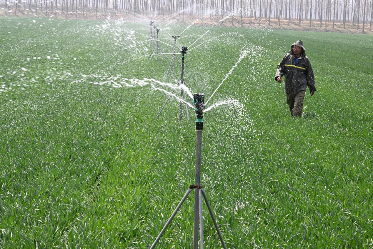 山东省青岛市即墨区段泊岚镇一处麦田,农民利用立杆式旋转喷头喷灌设备给为拔节期小麦开展春浇作业。(张涛 摄)